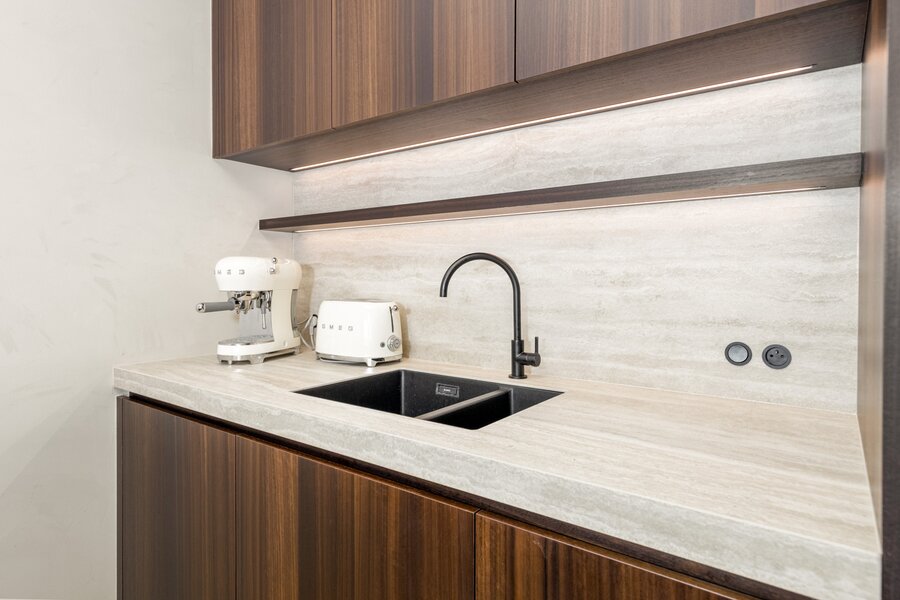 De volledig uitgeruste keuken beschikt over een vrijstaand kookeiland met Miele-wijnkoelkast en een inductiekookplaat met geïntegreerde dampkap van Novy. De walnoten kastenwand is voorzien van een ingebouwde combi-oven, vaatwasser, koelkast en diepvriezer, allen van AEG. Het werktablet en de spatwand zijn uitgevoerd in natuurlijke travertin, wat het luxueuze karakter van de keuken verder versterkt.