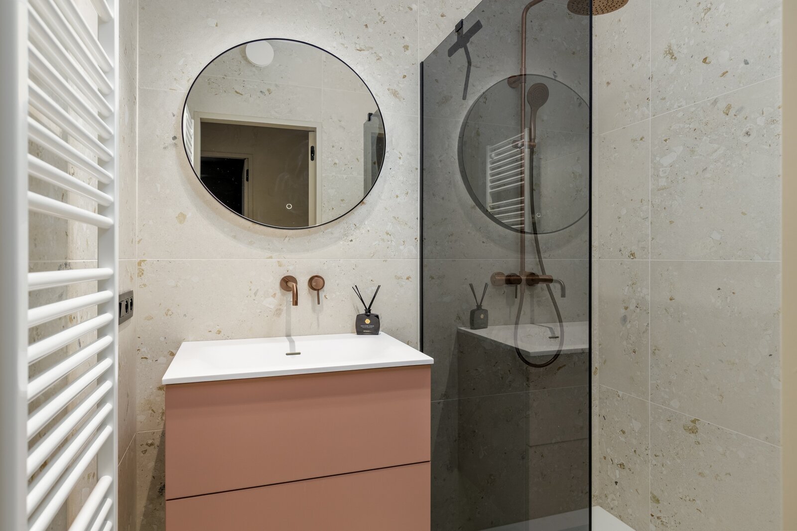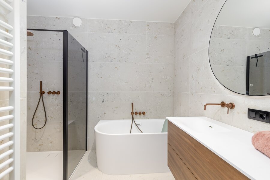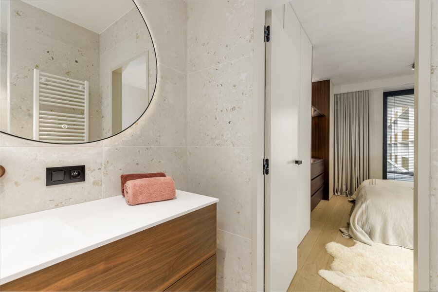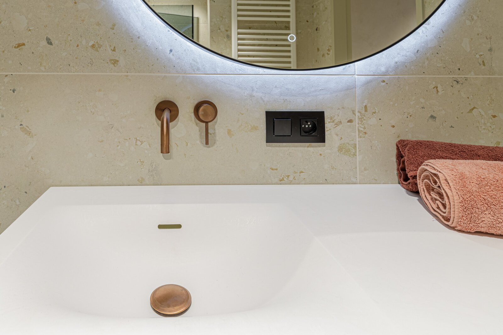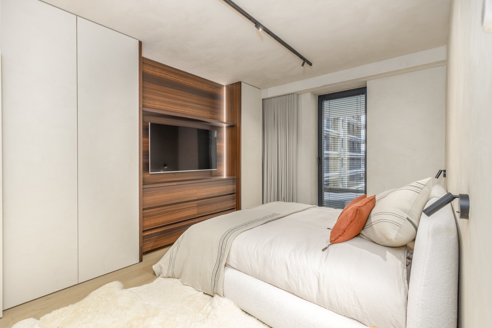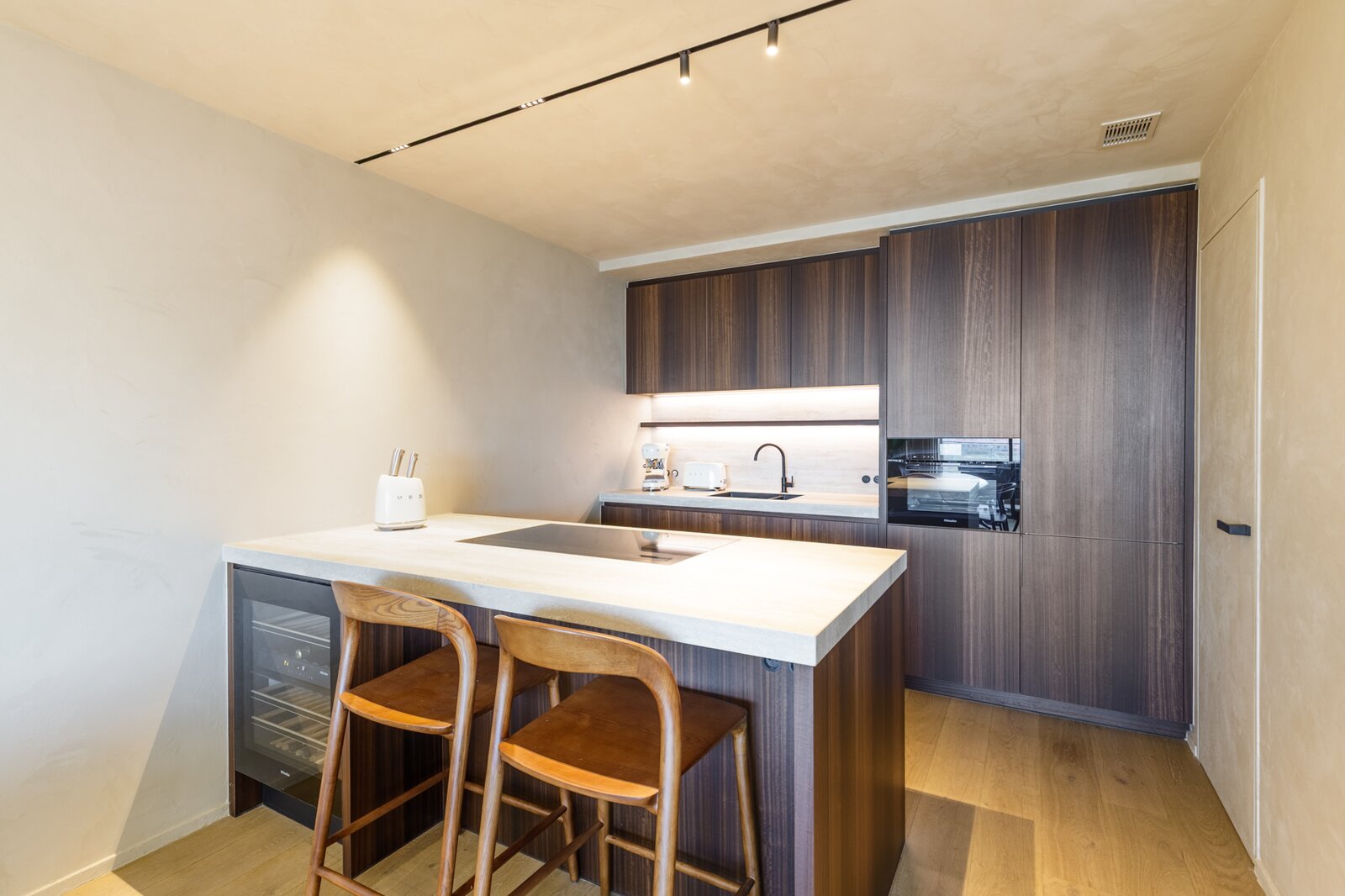 Het volledige appartement is afgewerkt met Mortex, gecombineerd met massief parket. De badkamers en het toilet zijn stijlvol betegeld met Terrazzo-tegels, wat bijdraagt aan de exclusieve uitstraling.