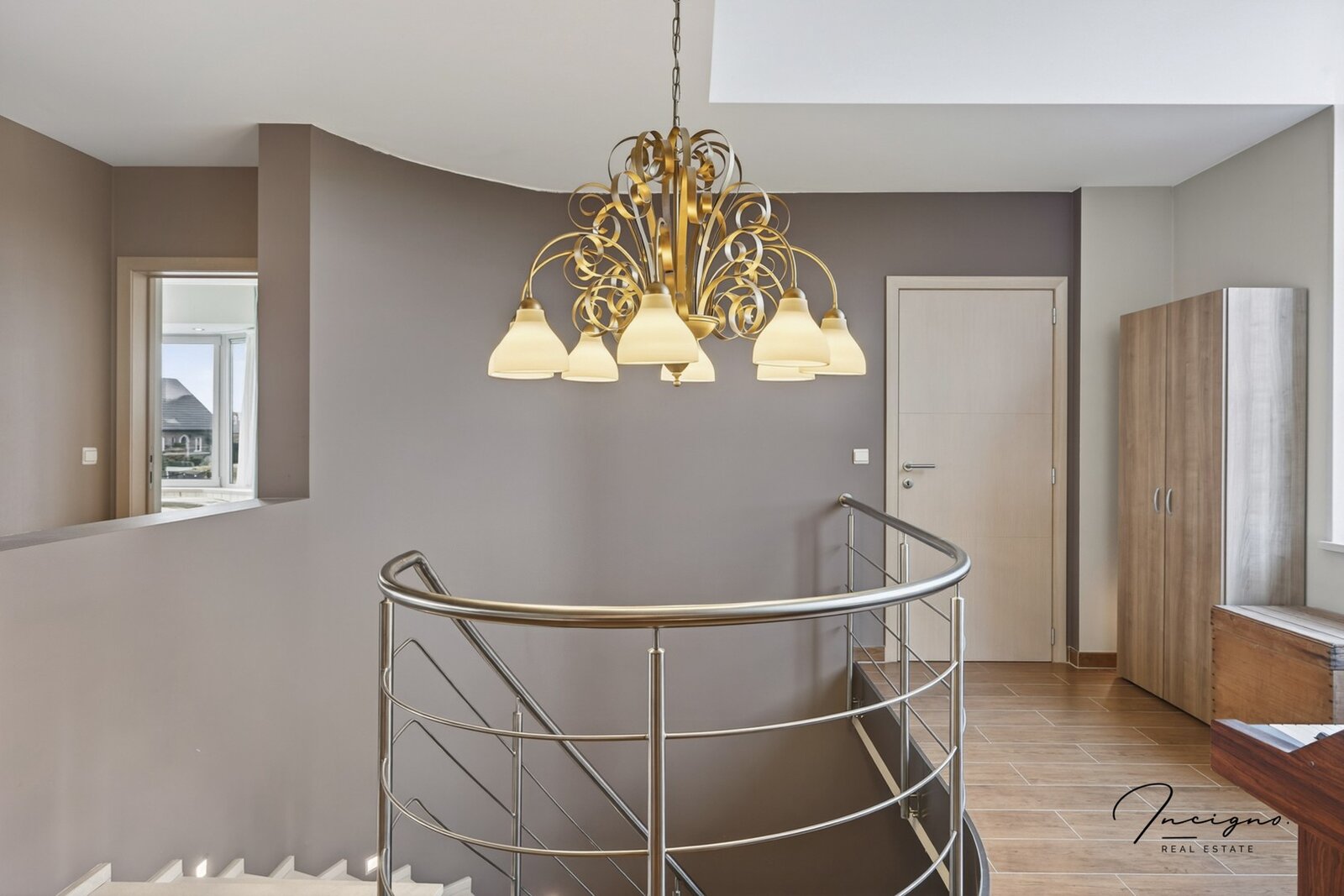 Op de verdieping leidt de ruime overloop naar vier (slaap)kamers, een apart toilet en een luxueuze badkamer met ligbad, dubbele inloopdouche en dubbele wastafel. Eén van de slaapkamers geeft toegang tot een aangenaam terras met uitzicht op het omliggende groen. Mogelijkheid tot uitbreiden van één slaapkamer met ensuite badkamer of extra dressing aangezien alle leidingen en afvoeren reeds voorzien zijn.