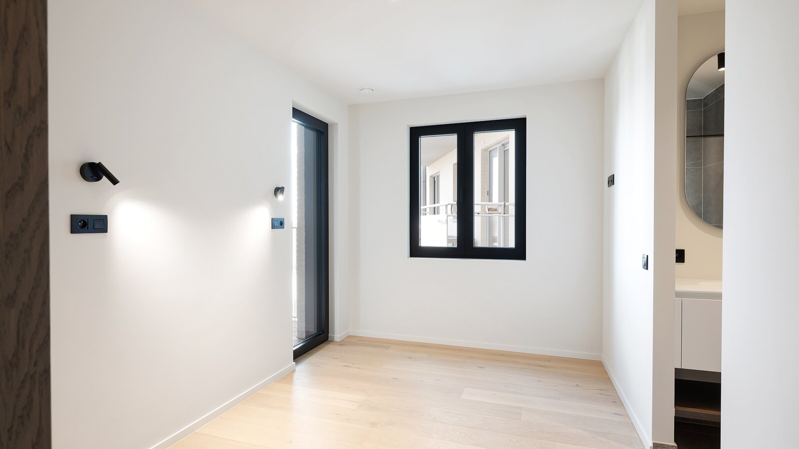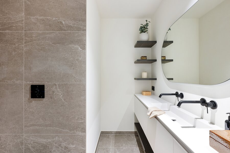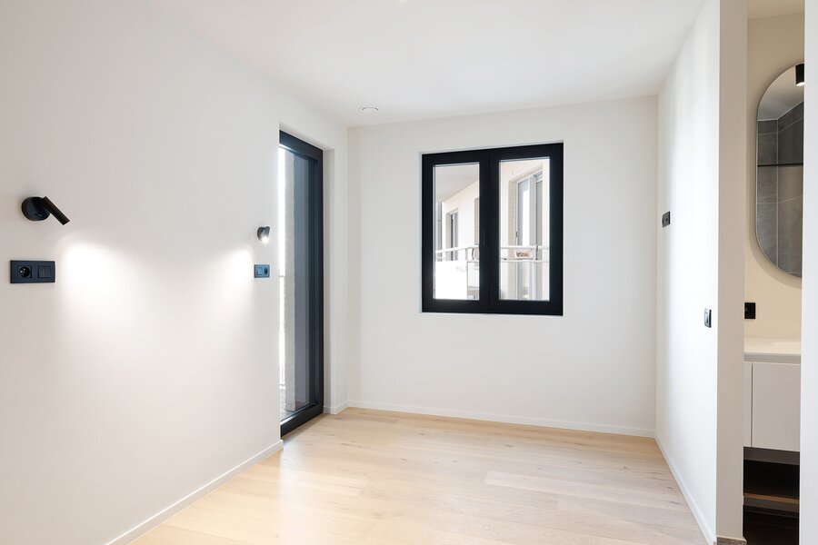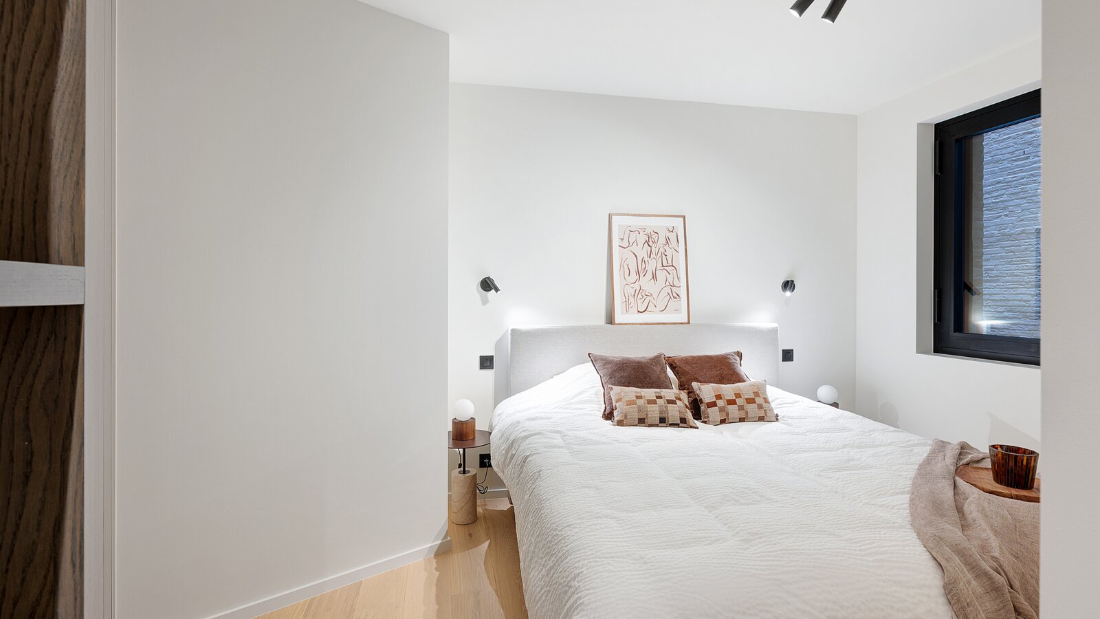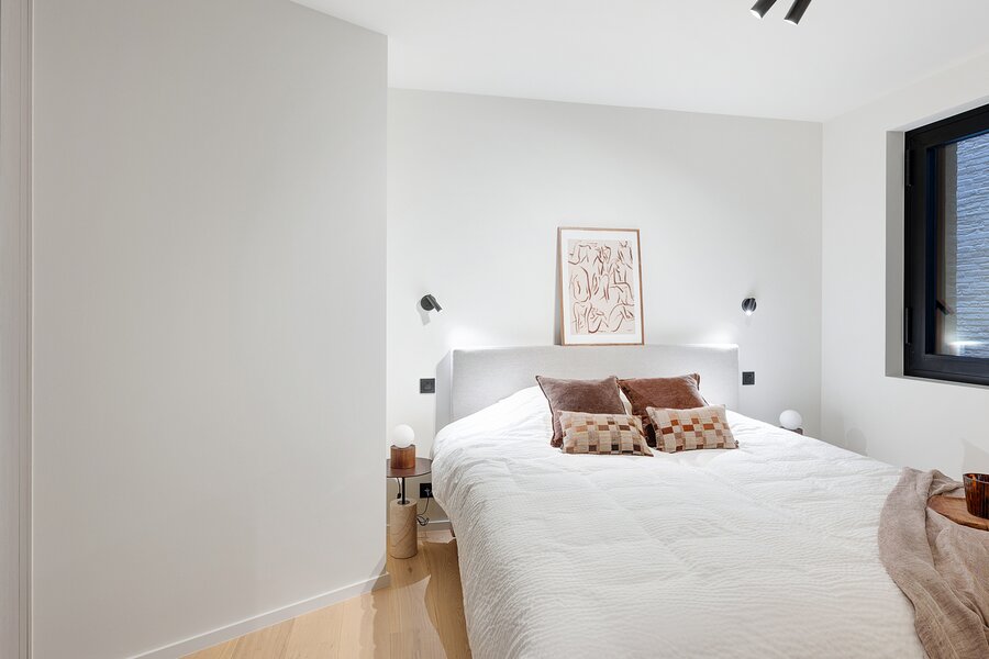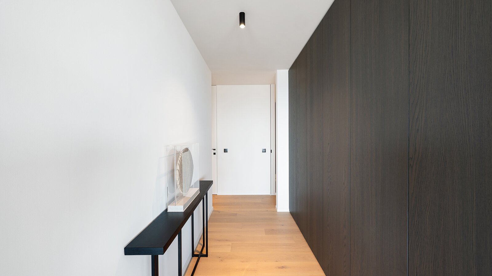 An elegant entrance hall with bespoke wardrobe and guest toilet. A magnificent, light-filled reception area with expansive floor-to-ceiling windows, enjoying uninterrupted sea views and opening onto a generous terrace. The living space comprises a refined lounge, dining area and a fully equipped open-plan kitchen with premium appliances (Miele, wine fridge, …), complemented by an adjoining laundry/storage room. The night hall features custom-built cabinetry and a separate toilet. The master suite offers a luxurious en-suite bathroom with walk-in shower, bathtub, double vanity and toilet. Second bedroom with private en-suite shower room. Both the first and second bedrooms open onto a shared rear terrace. Third bedroom with its own en-suite shower room.