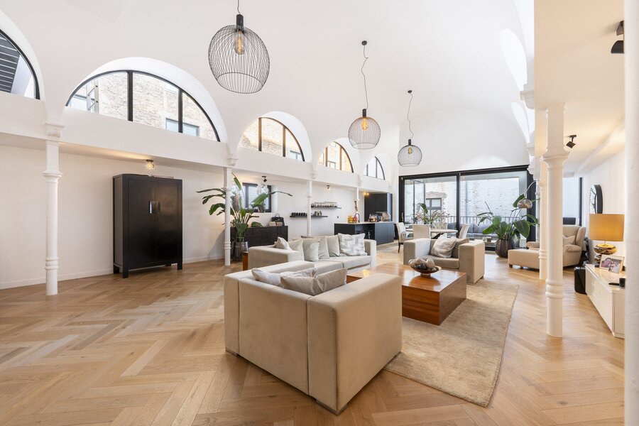 The entrance hall with guest toilet leads to a spacious living area. The high curved ceilings and numerous windows create space and light. The old pillars give the space a unique character. The open kitchen is equipped with all the usual appliances. Adjacent to the living area is a pleasant terrace that enjoys the necessary privacy.