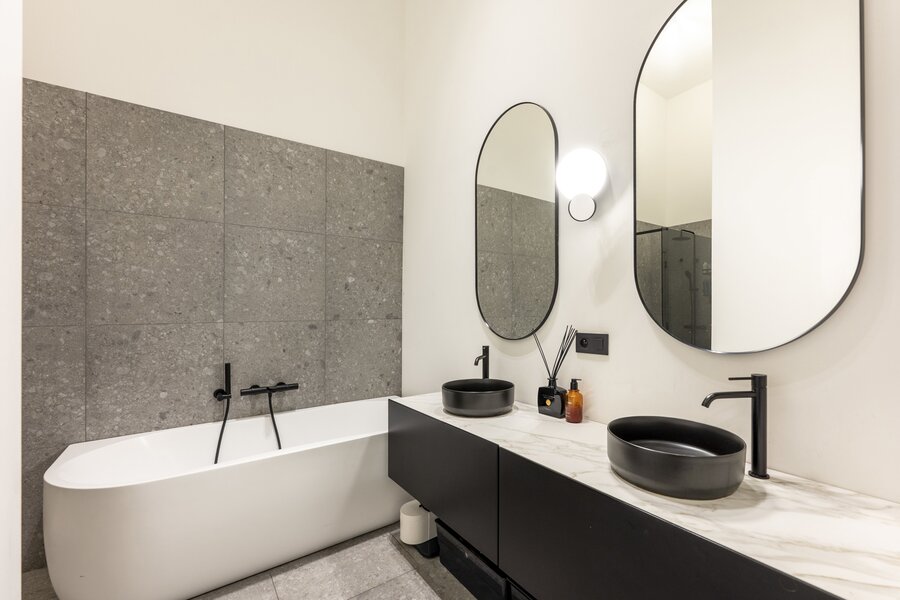 The flat also has two spacious bedrooms and a stylish bathroom with double sink, bathtub and walk-in shower.