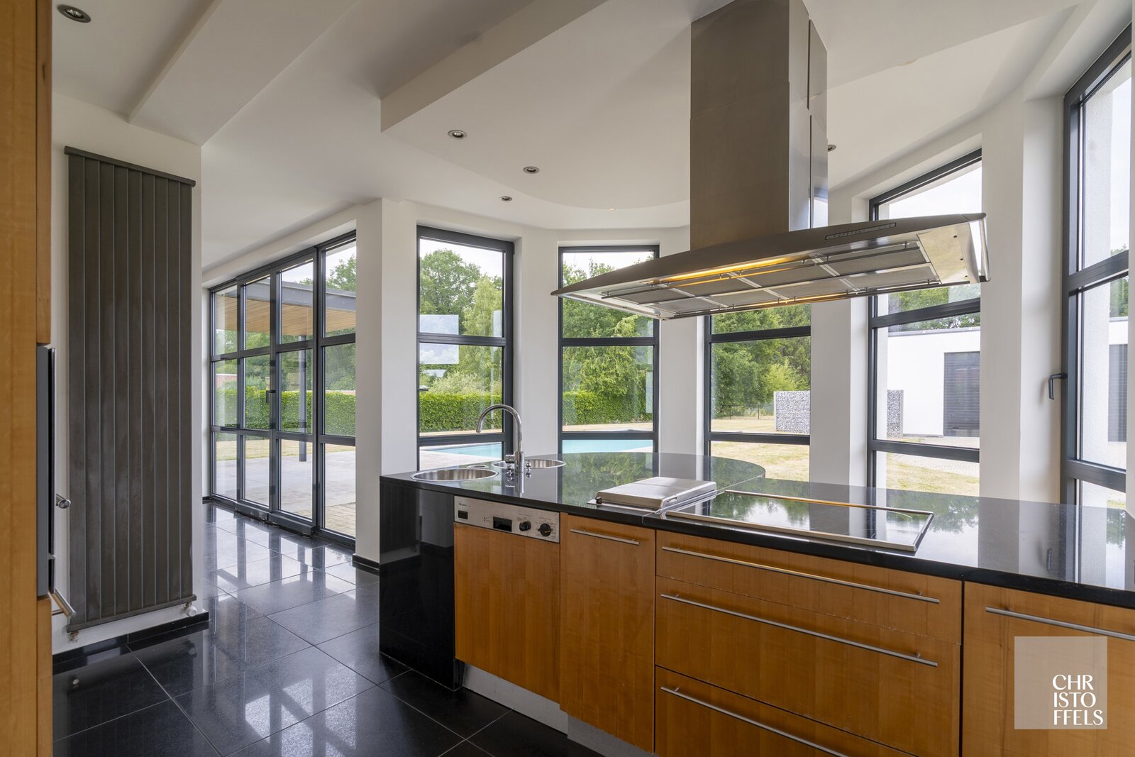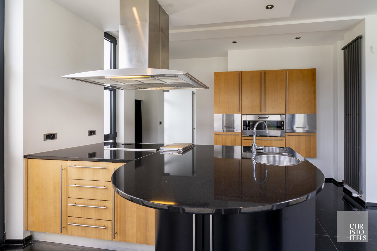 The kitchen is equipped with a granite countertop and appliances including an oven, steam oven, dishwasher, double sink, ceramic hob, deep fryer, and extractor hood.