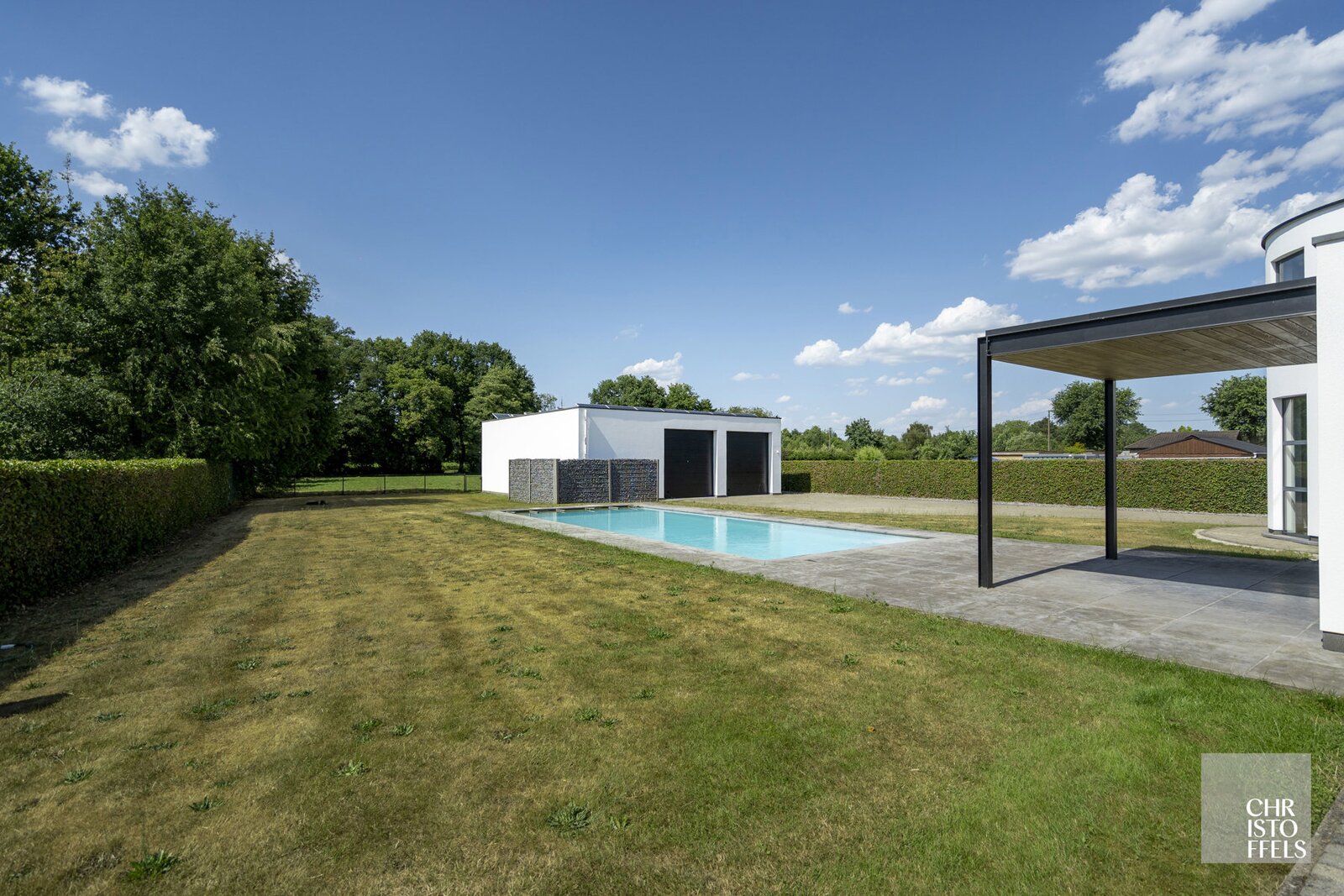 Outside, you can enjoy a fully fenced, well-maintained garden with a swimming pool. The garden offers a large terrace, an adjoining pasture, and a multifunctional outbuilding that is ideal for extra storage or can be converted into a relaxation area