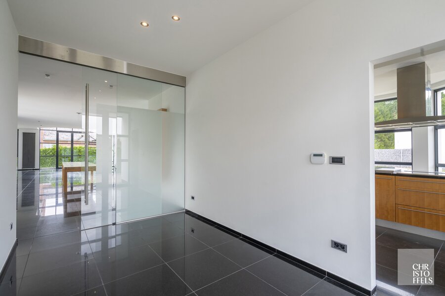 The house welcomes you with a large entrance hall featuring a cloakroom and a guest toilet. The bright living room offers both a cozy sitting area and a dining space that open onto the terrace and connect directly to the open kitchen and the home office. From the kitchen, you can access a practical storage room and a separate laundry room. Additionally, the house includes a double integrated garage with extra storage space.