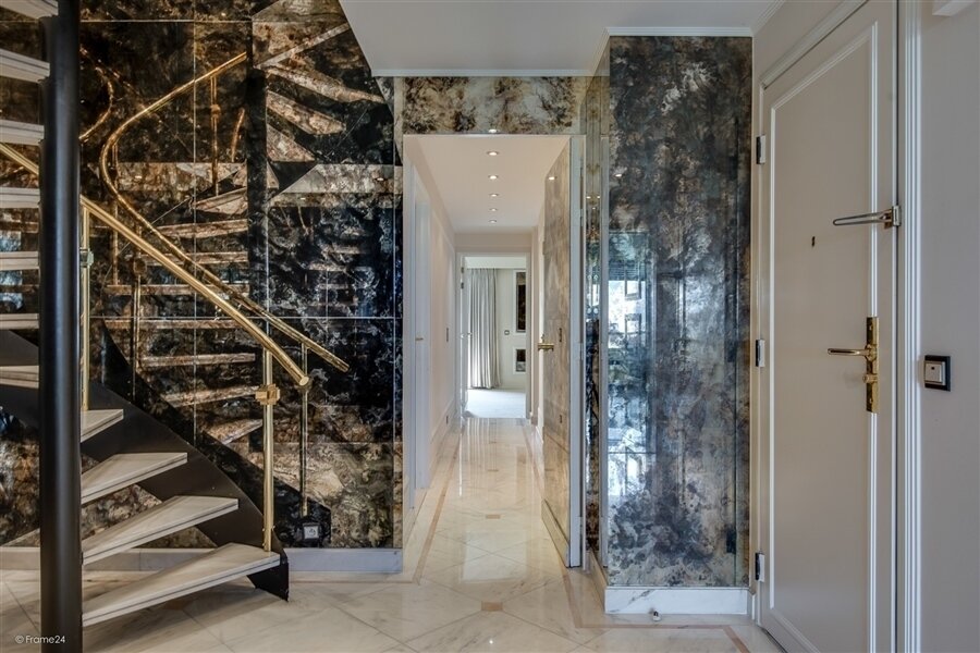 Spacious, bright living room with marble flooring across the entire width of the apartment and panoramic views over Antwerp.
