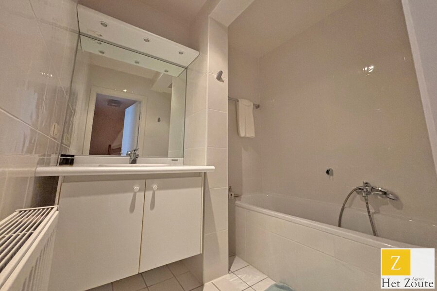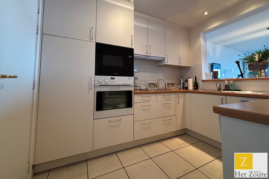 Het appartement beschikt over een inkomhal die toegang geeft tot alle ruimtes, een berging met ketel, en een halfopen keuken met aansluitende praktische berging, uitgerust met wasmachine en droogkast. De ruime en lichtrijke woonkamer biedt een uitzicht op zee en geeft uit op het terras.