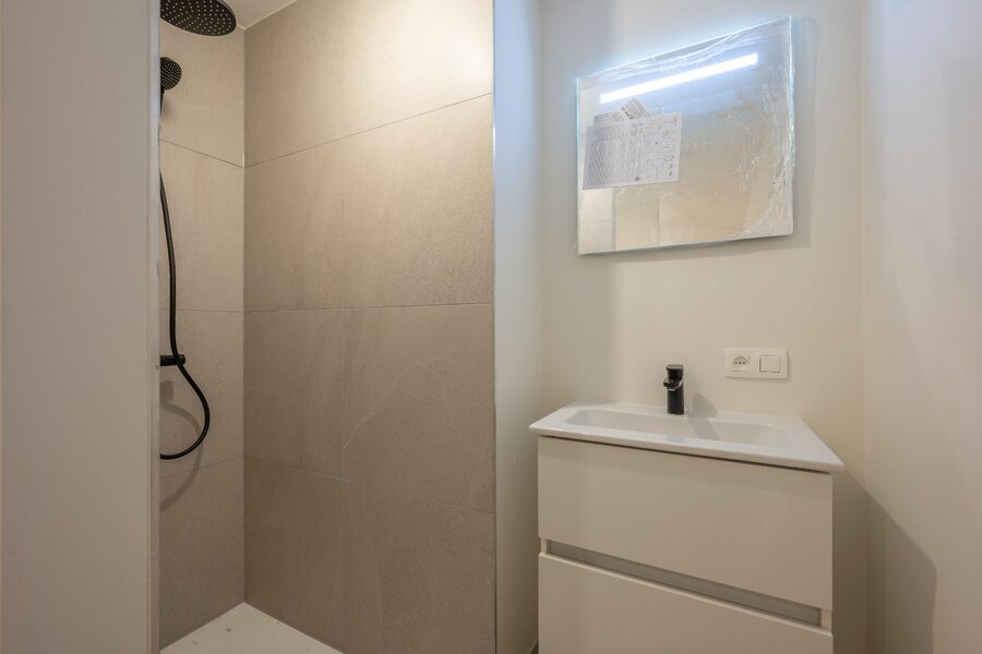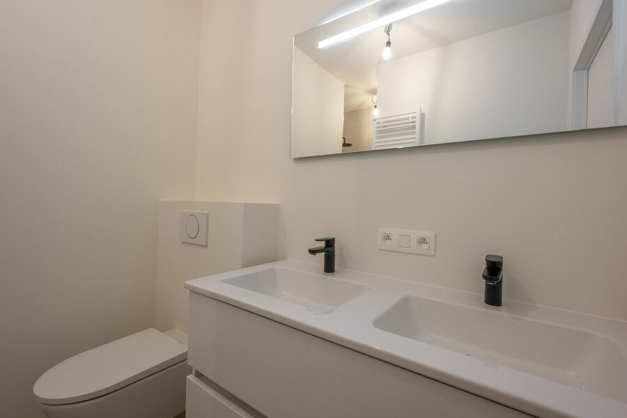 Inkomhal met gastentoilet en vestiaire. Lichtrijke leefruimte en open keuken, terras van 6,40m2. Eerste volwaardige slaapkamer en aparte badkamer (douche + dubbele lavabo). Tweede volwaardige slaapkamer met een ensuite douchekamer. Berging met plaats voor was- en droogmachine.