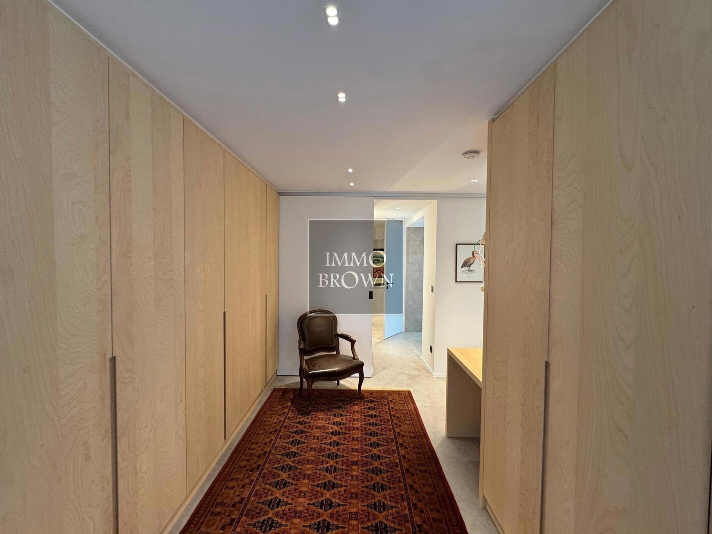 A hallway with custom-built wardrobes leads to a sleek shower room, while a separate toilet is conveniently located nearby.
