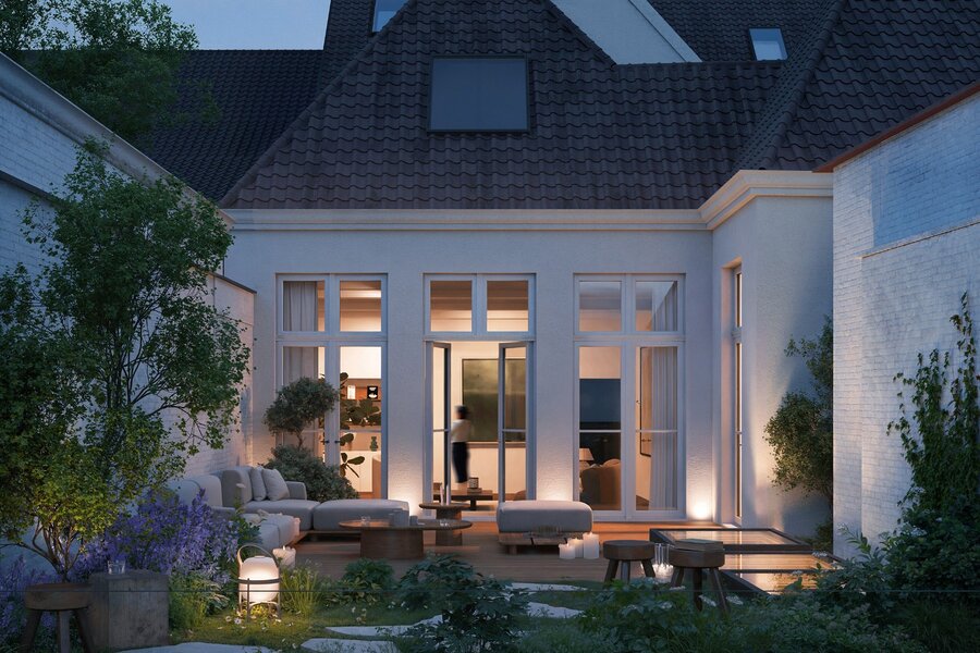 De grandeur van weleer begint bij het betreden van dit uitzonderlijk stadsappartement. Met een vrije hoogte van ca. 3,18 m en de bewaarde authentieke elementen waaronder de schouwen en sierplafonds. Dit appartement met een bruto woonoppervlakte van ca. 153 m² beschikt over twee slaapkamers, twee badkamers, en biedt vanuit de leefruimte toegang tot een dakterras van ca. 39,9 m². De leefruimte vormt het hart waar licht en een uitzonderlijk gevoel van ruimte samenkomen. De keuken ligt discreet verdoken, maar biedt een open karakter naar de leefruimte. De buitenruimte wordt ingericht als een terras en een zone groendak.