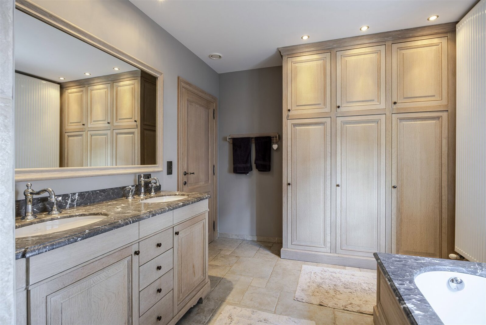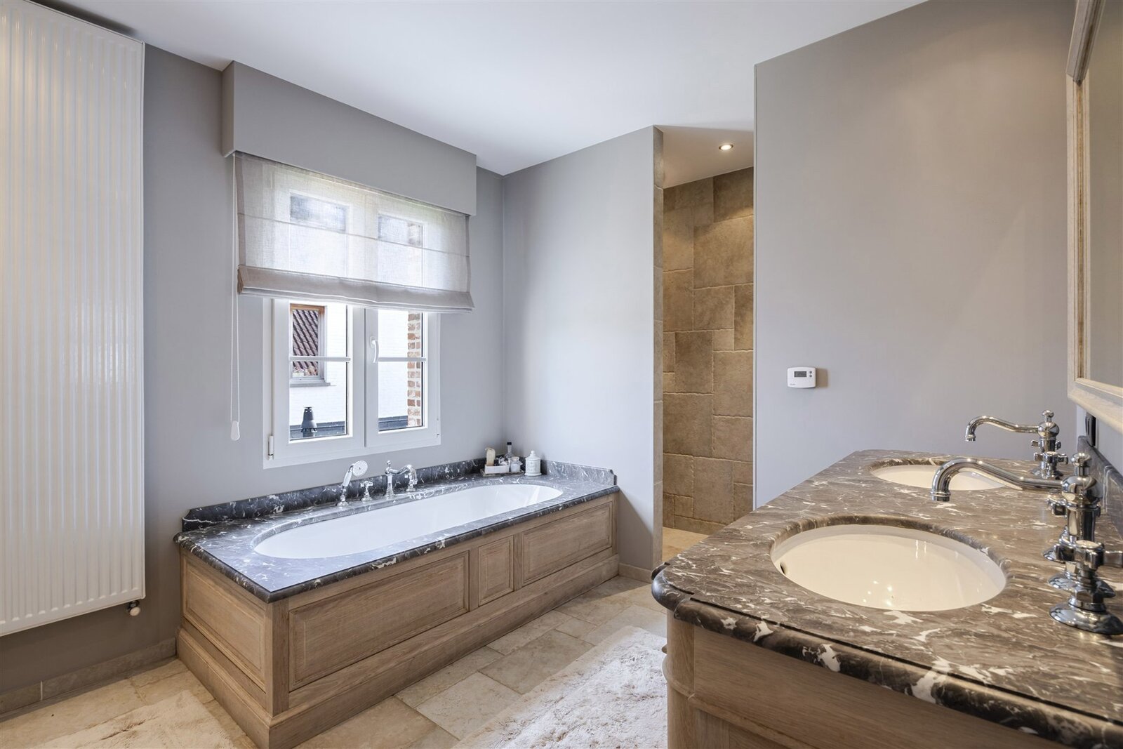 Badkamer met ligbad, douche, dubbele wastafel.