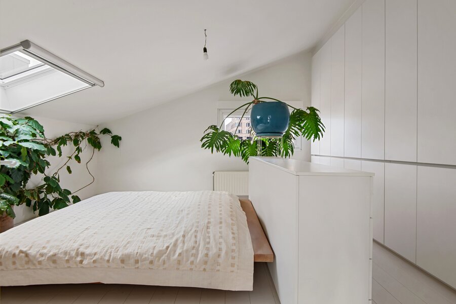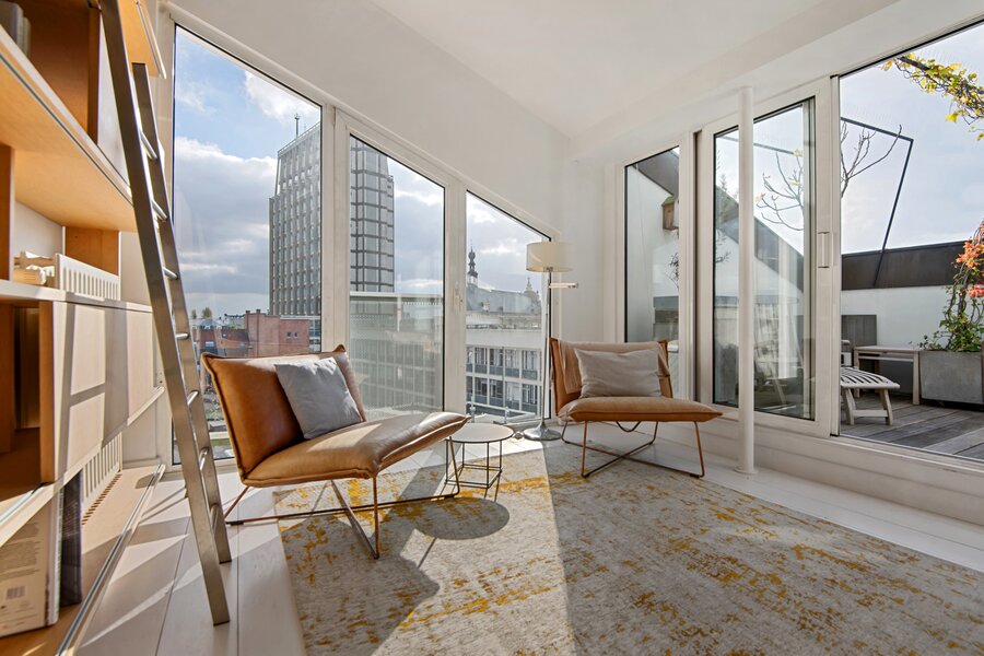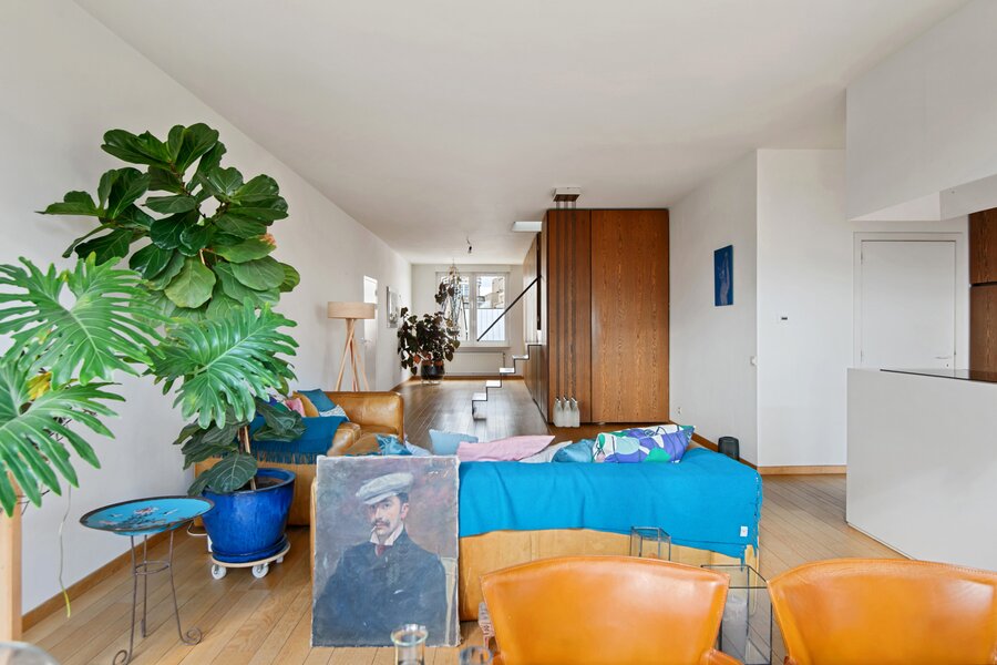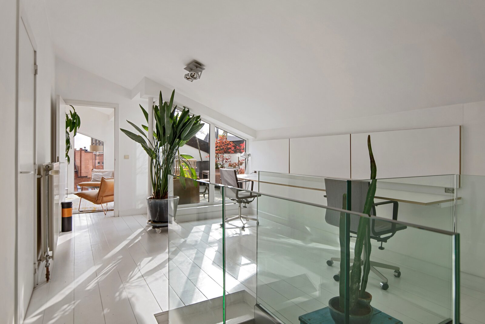 This excellently finished duplex penthouse on the fourth floor offers exceptional living comfort with a thoughtful layout and abundant natural light. On the first floor, there is a spacious living area with an open kitchen, equipped with all comforts, a first bedroom with an adjoining bathroom, and a separate guest toilet. Thanks to the large windows, the entire floor enjoys a pleasant natural light. On the second floor, there is an open lounge area and a bright office space that provides direct access to a sunny roof terrace of approximately 15 m². Furthermore, there is a second bedroom with a built-in dressing room and a spacious adjoining bathroom. This penthouse stands out for its high-quality finish, ample natural light, practical layout, and the pleasant roof terrace with open views. In short, an ideal living space for those who love space, style, and comfort. The underground parking space in the complex is mandatory to rent for €150 per month (bringing the total rent to €2,200 including parking). The monthly fixed costs amount to €290, while electricity, gas, water, and internet are to be connected by the tenant themselves.