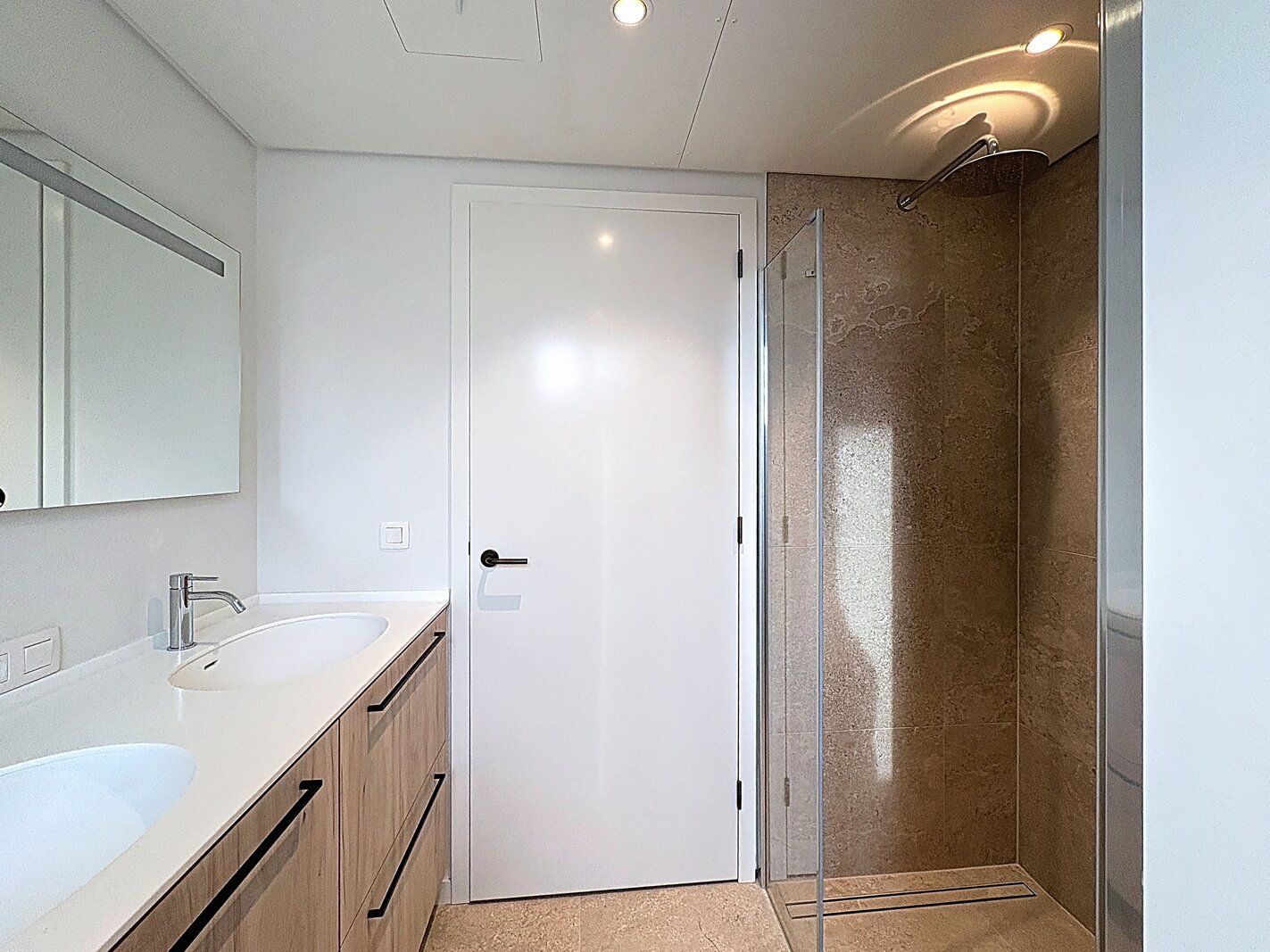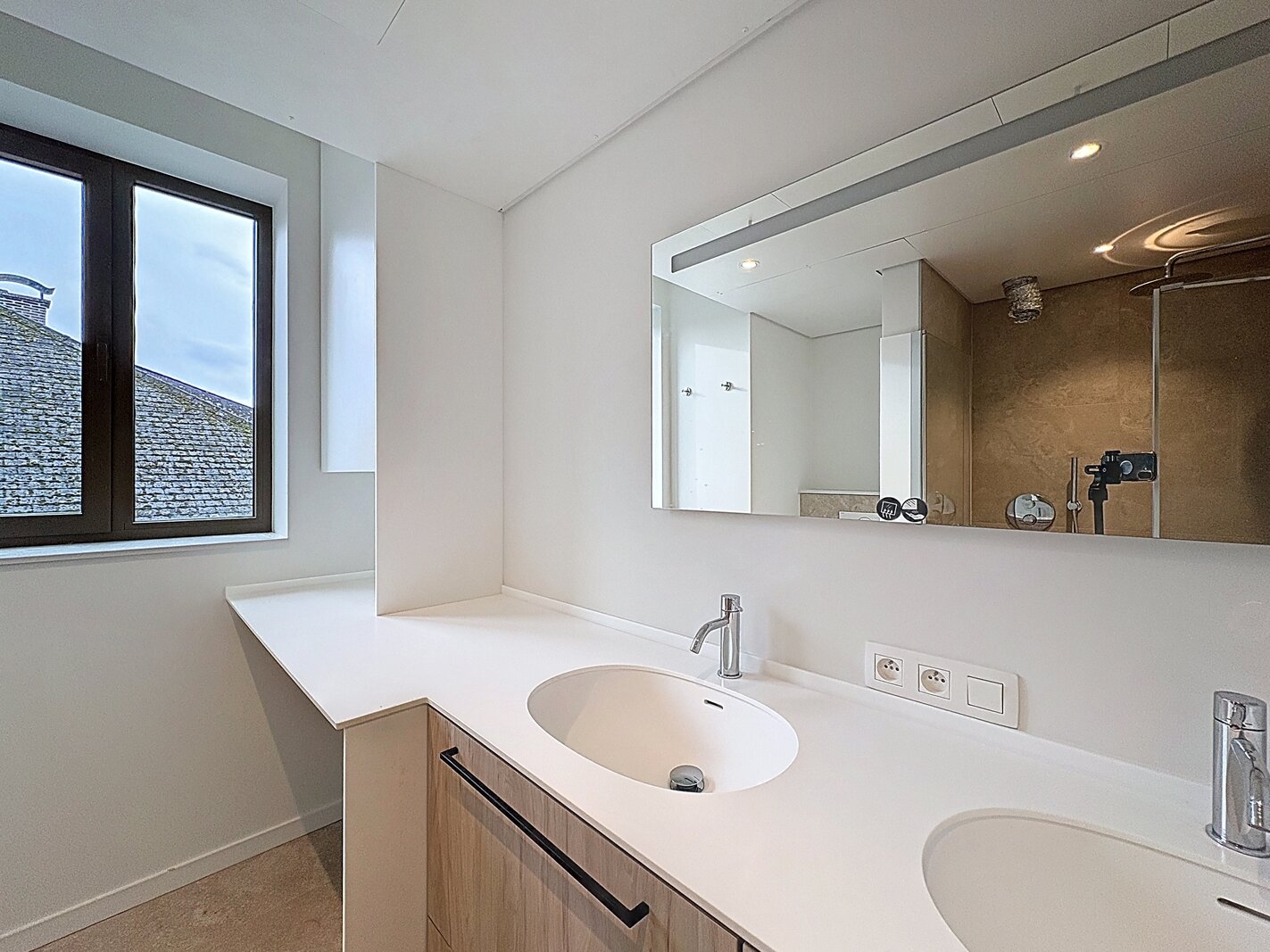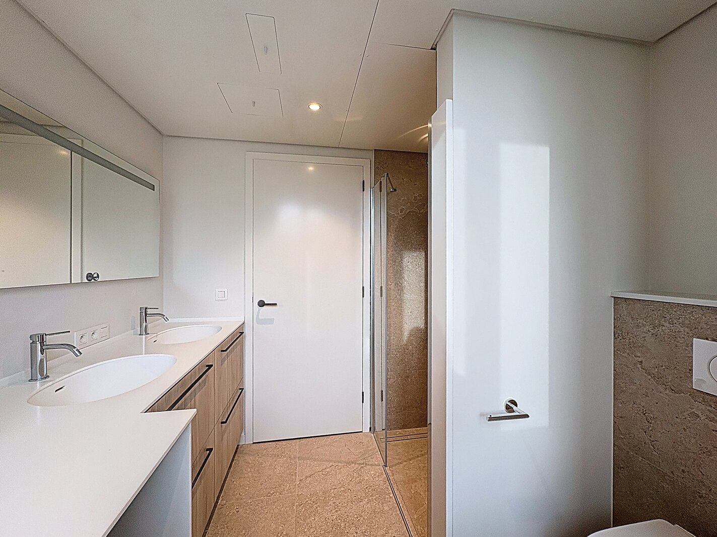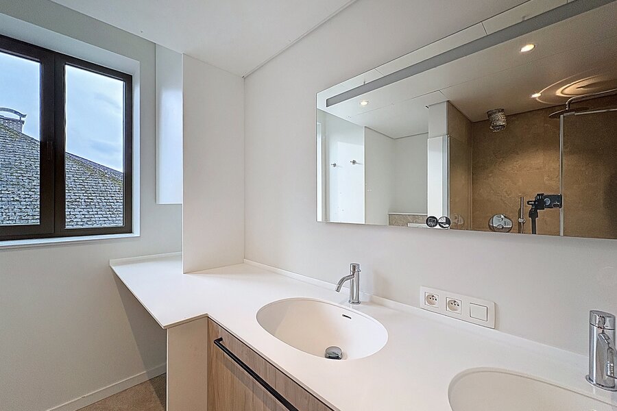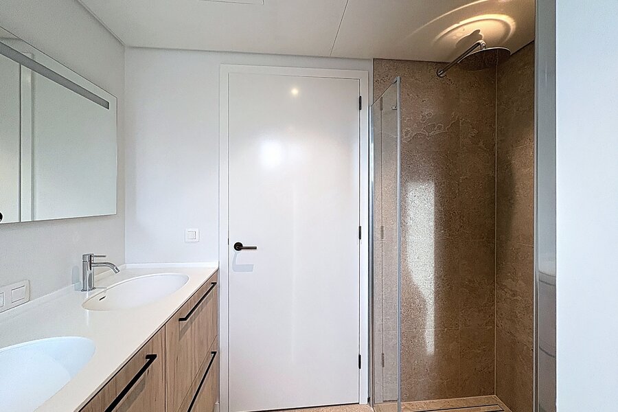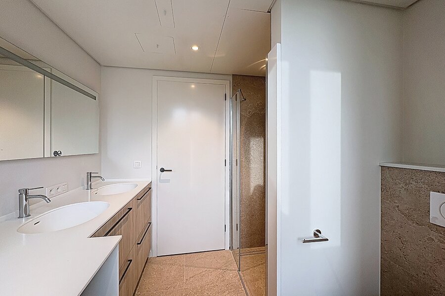 - Badkamer (8,1 m²) met dubbele wastafel, inloopdouche en aansluitingen voor wasmachine/droogkast