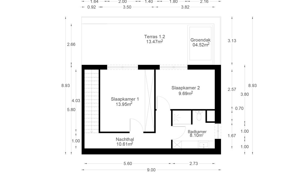 - Twee slaapkamers (13,95 m² en 9,69 m²)