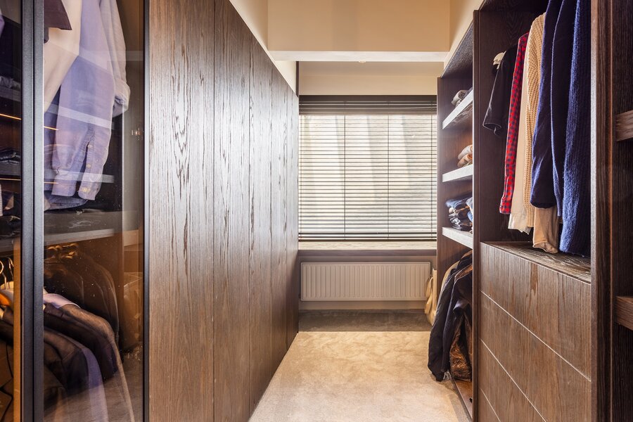 De hoofdingang is aan de kant van de Lambermontstraat en het huis is bereikbaar via het voorliggende appartementsgebouw. Aan de voorkant van de woning is het eerste terras gelegen met voldoende ruimte voor de inrichting van een eet- en zitgedeelte. Bij het betreden van het eigendom bevindt u zich in de inkomhal met trap en directe toegang tot de kelderverdieping met ondergrondse parking. De woonkamer met open keuken werd zeer smaakvol ingericht en voorzien van een bio-ethanolhaard. De keuken werd volledig uitgerust met Quooker-kraan, afwasmachine, combi-oven, koelkast, diepvries en wijnkoeler. De fineer houten kasten geven een prachtig contrast met de roze travertin. Aan de keuken werd ook een berging voorzien en een koer. Op de eerste verdieping bevinden zich nog twee slaapkamers. Beiden hebben toegang tot het zonovergoten terras en een en-suite badkamer met douche. De grootste slaapkamer beschikt ook over een inloopdressing. Bovendien is er boven nog een berging en open ruimte die kan worden ingericht als bureau of derde slaapkamer.