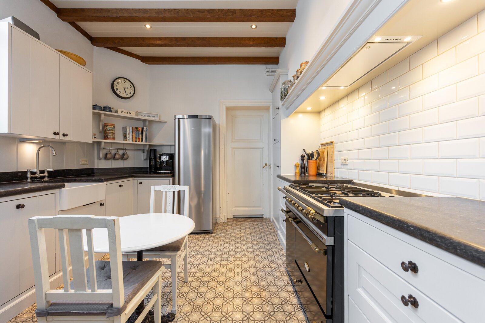 • Landelijke keuken met spoelbak, vaatwasser en lacanche fornuis