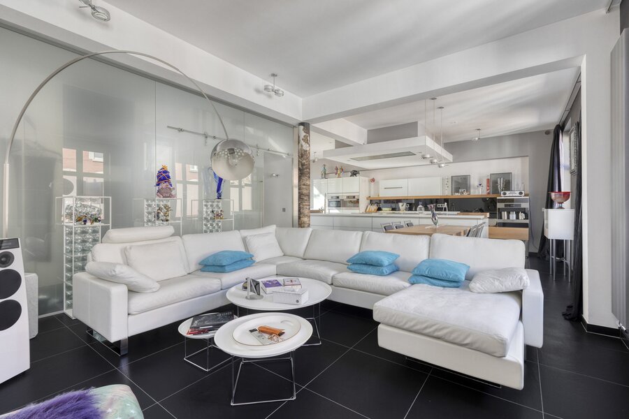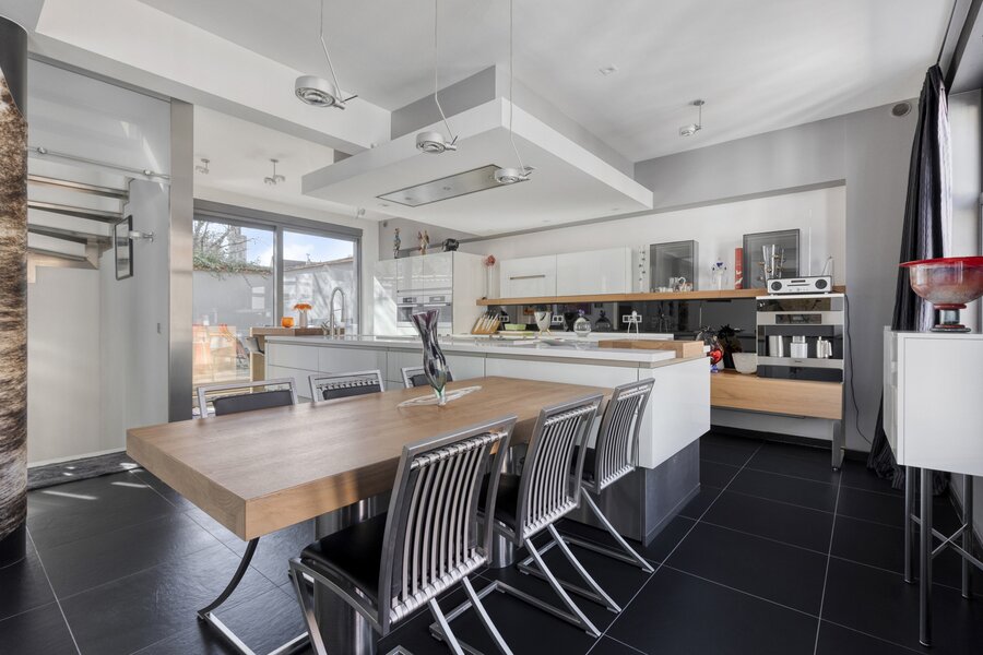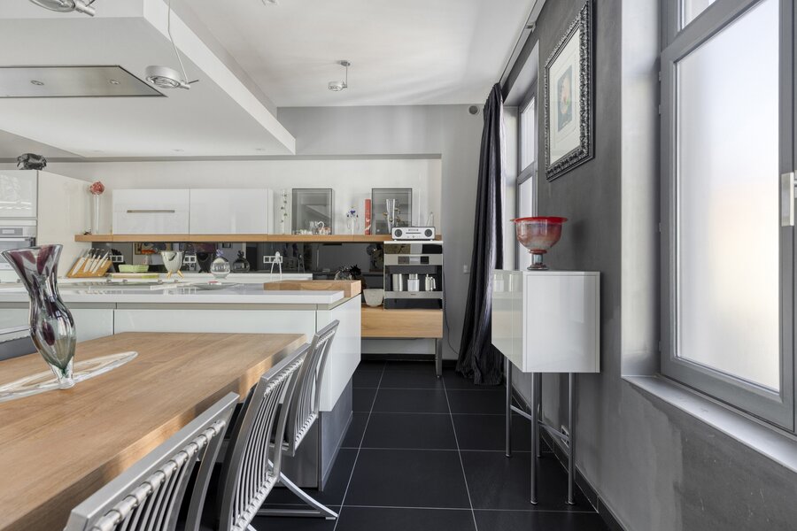 1ste verdieping: toilet, living met luxe keuken, ruim terras.
