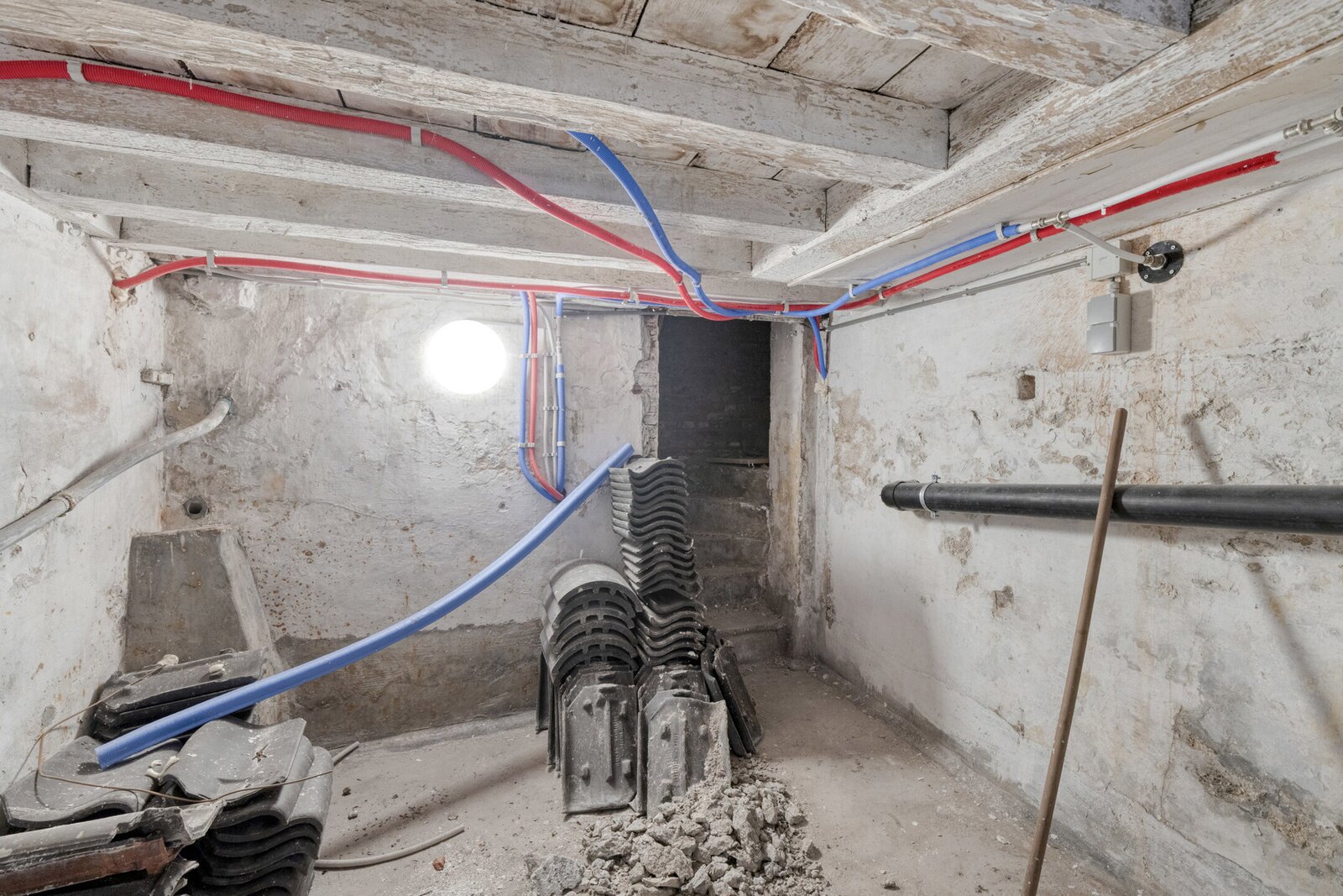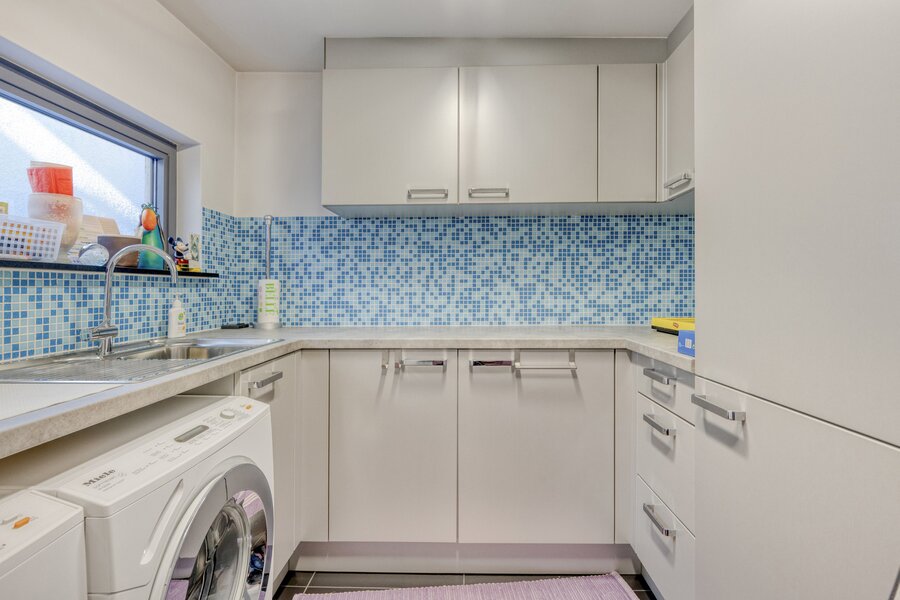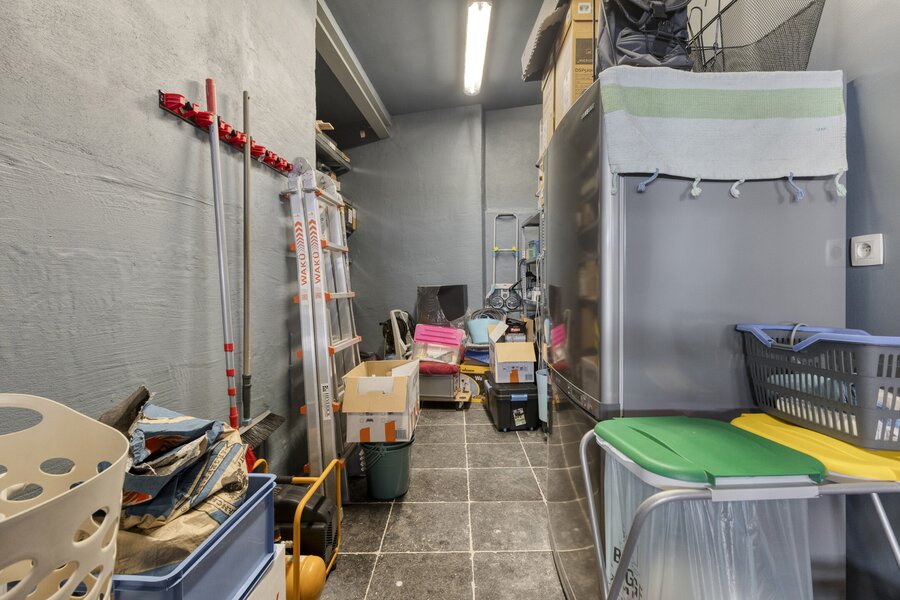 Gelijkvloers: Inkomhal, dubbele garage, berging, wasplaats, gelijkvloers buitenberging, kelder.