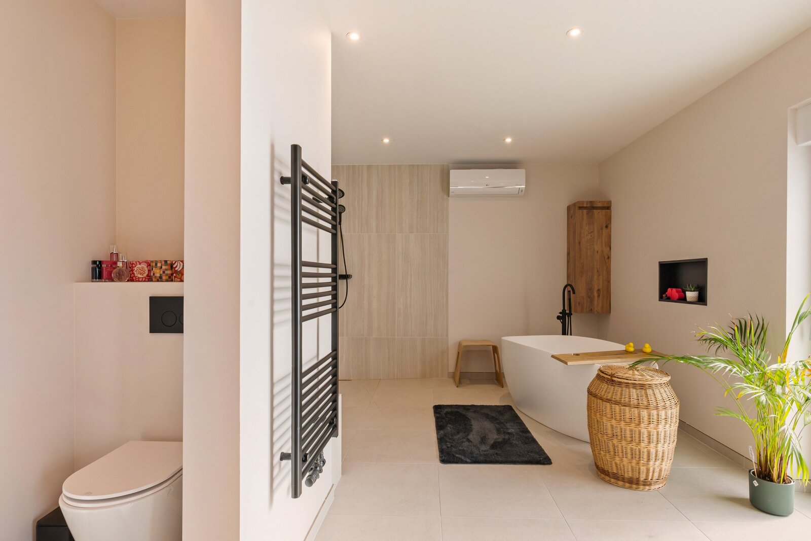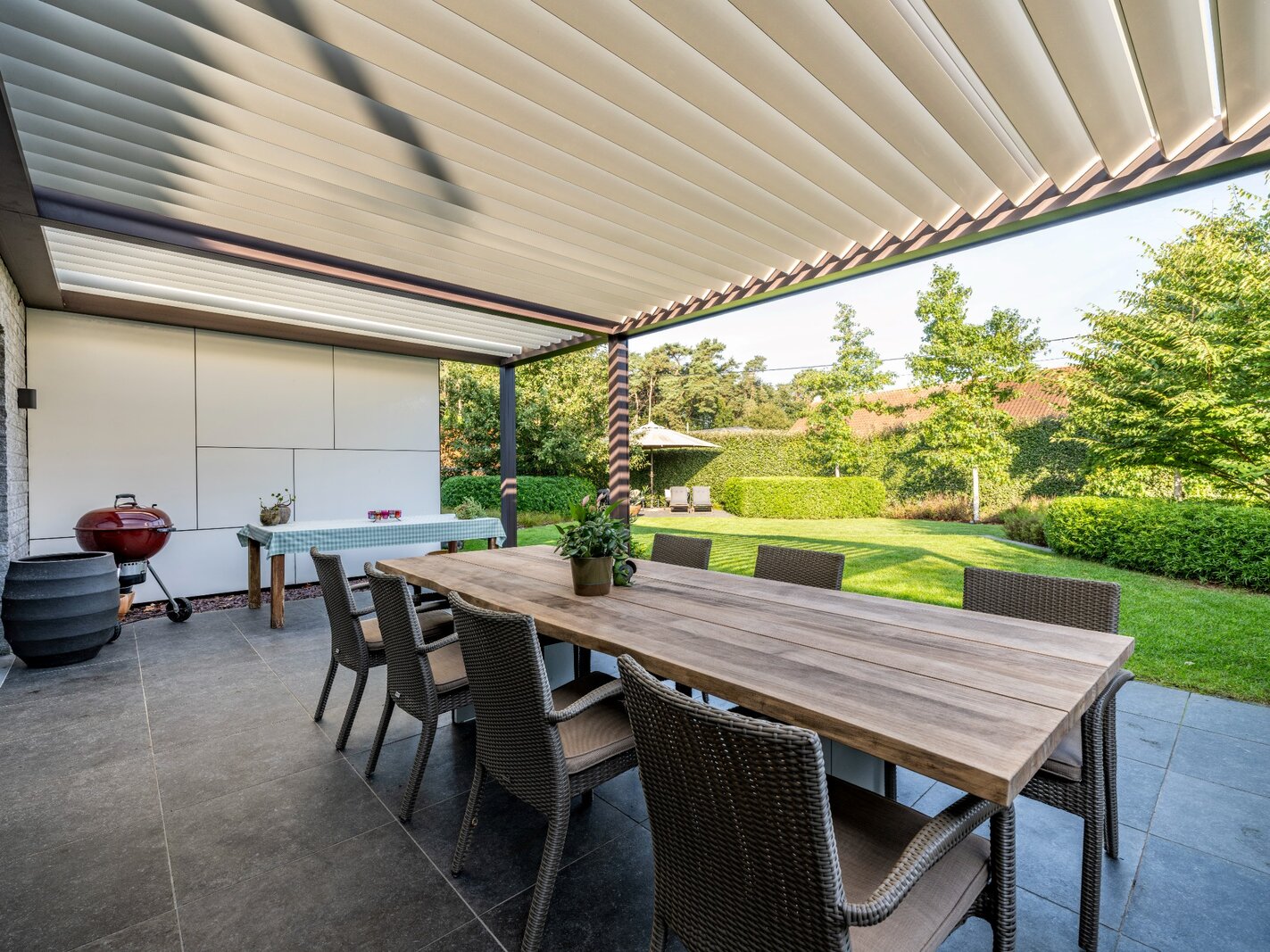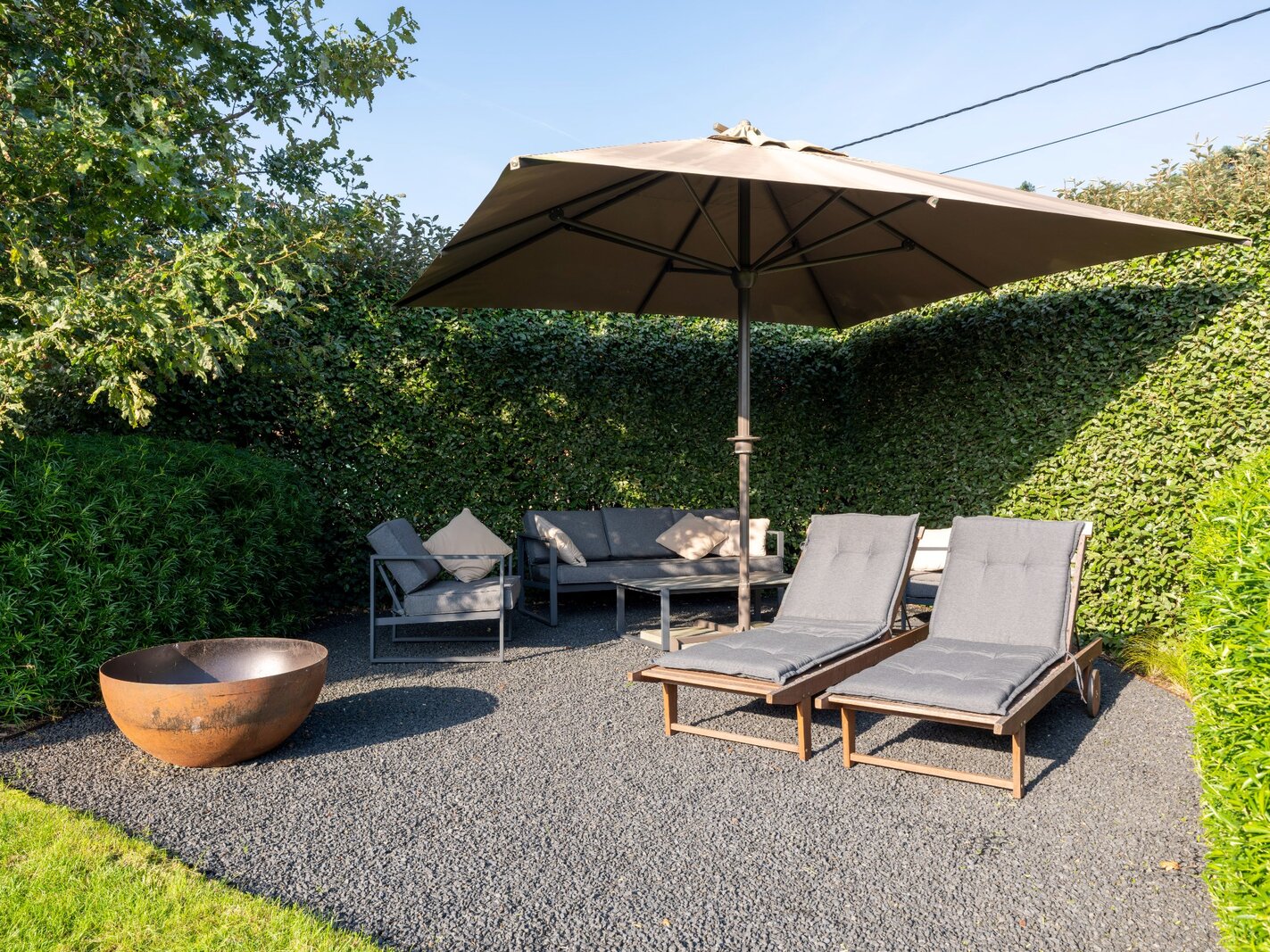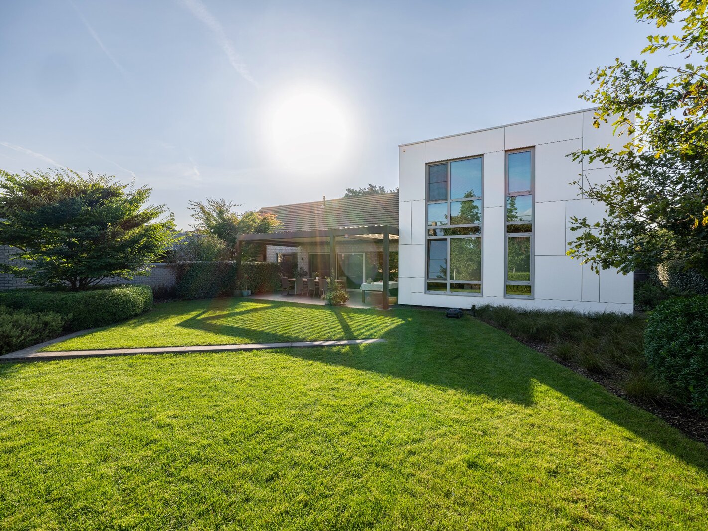 Aansluitend treft u de volledige ingerichte keuken voorzien van alle comfort. Van hieruit heeft u toegang tot een koele berging. Gelijkvloers is er de masterbedroom met aanpalende badkamer en dressingruimte. Langs de keuken is er een berging met toegang tot de tuin achteraan.