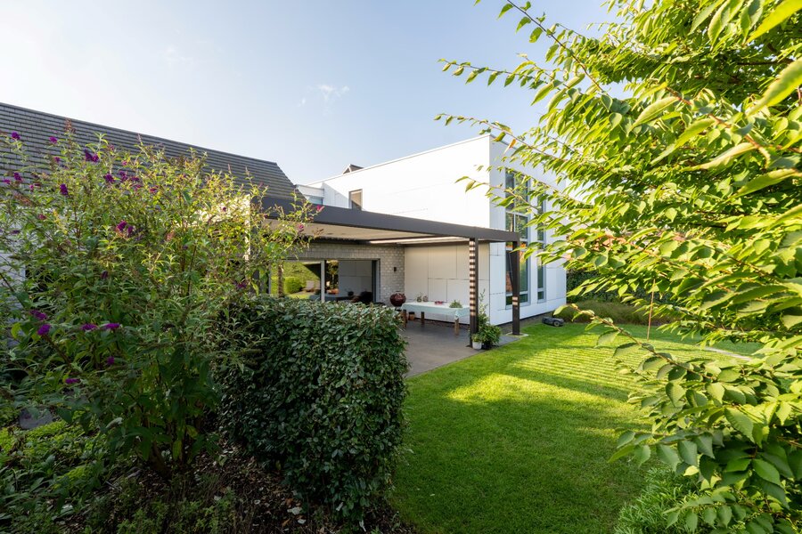 Via de inkomhal met gastentoilet heeft u enerzijds toegang tot de leefruimten en anderzijds tot de praktijkruimten (linkerzijde woning). De leefruimte is zeer ruim opgevat: gezellige zitruimte met gashaard en een eetgedeelte. De grote raampartijen bieden een mooie connectie met de gezellige tuin voorzien van ruim overdekt terras achteraan dewelke veel privacy biedt.