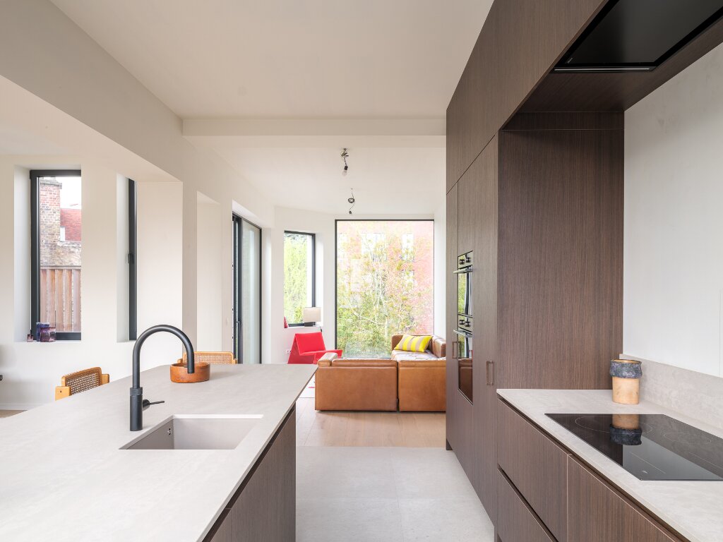 Een privatieve en indrukwekkende inkomhal geeft toegang tot een energiezuinige townhouse met een bruto vloeroppervlakte van maar liefst 247 m². De woning beschikt over een ruime leefruimte, voorzien van een luxueuze keuken, en geniet van veel lichtinval dankzij de hoge ramen en het doorzon-effect.