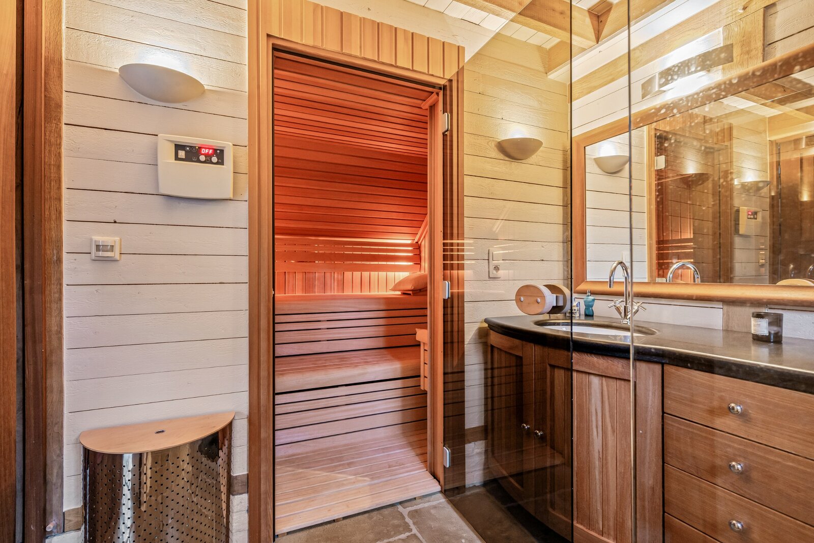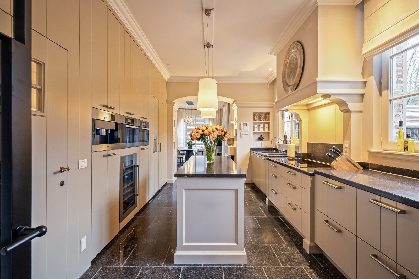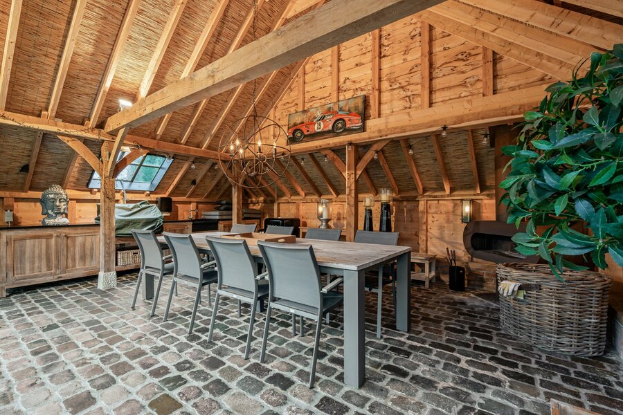 Aansluitend treft u de gezellige en volledig ingerichte luxe keuken uitgerust met inductiekookplaat, vaatwasser, stoomoven, combi-oven, koelkast, diepvriezer, koffiezetapparaat en wijnklimaatkast.