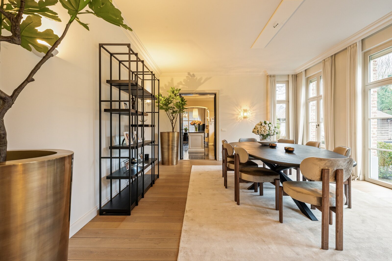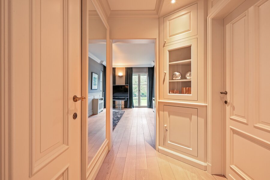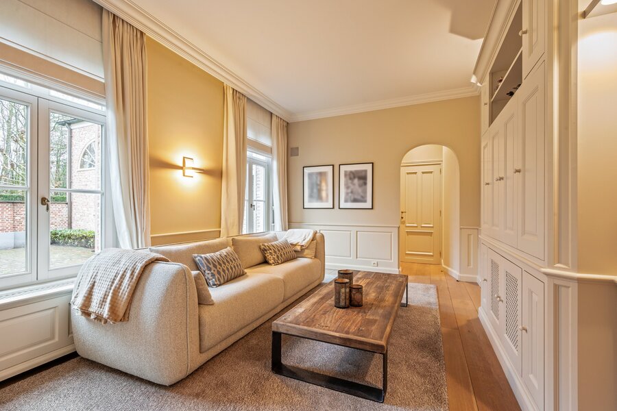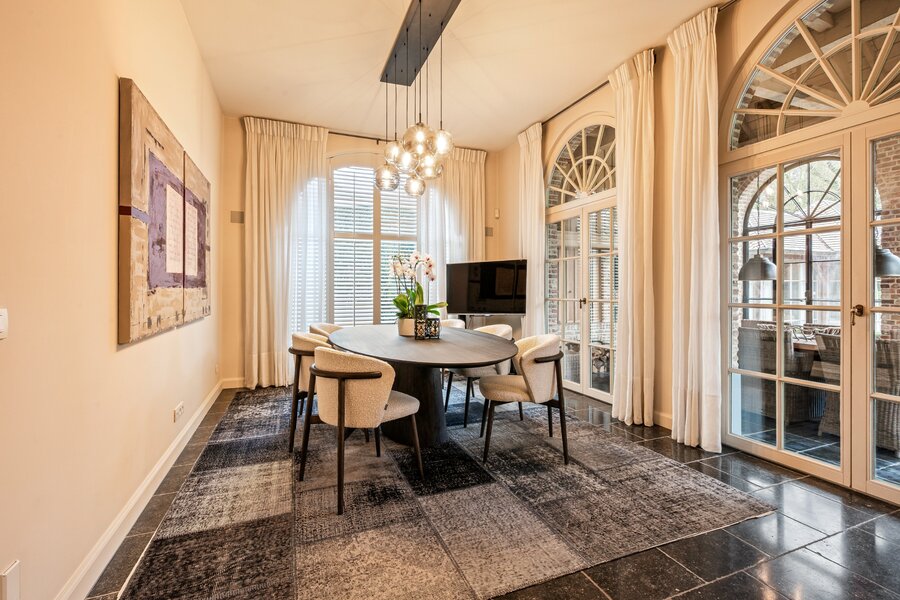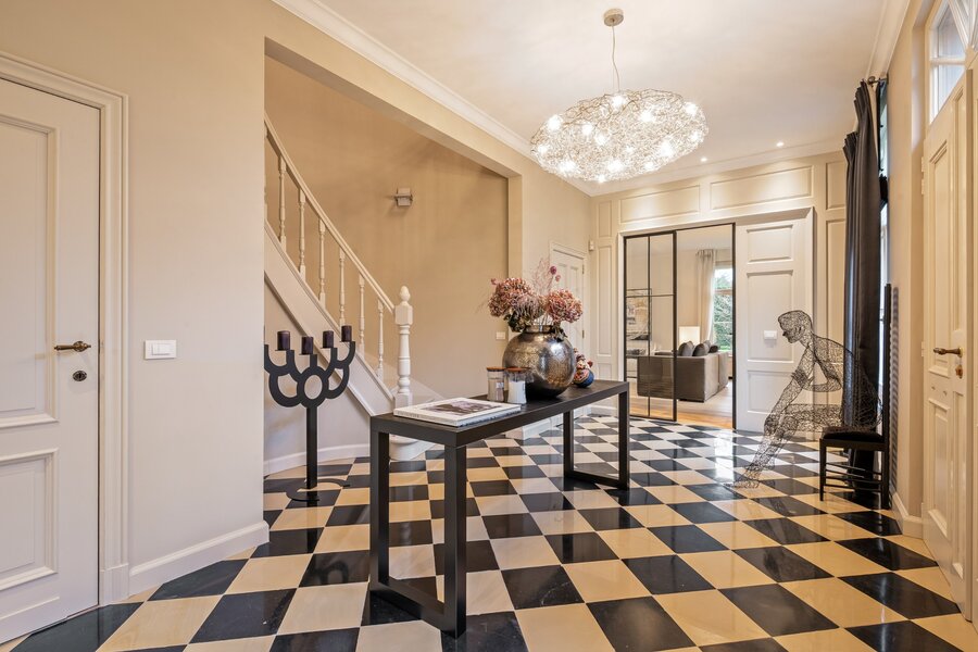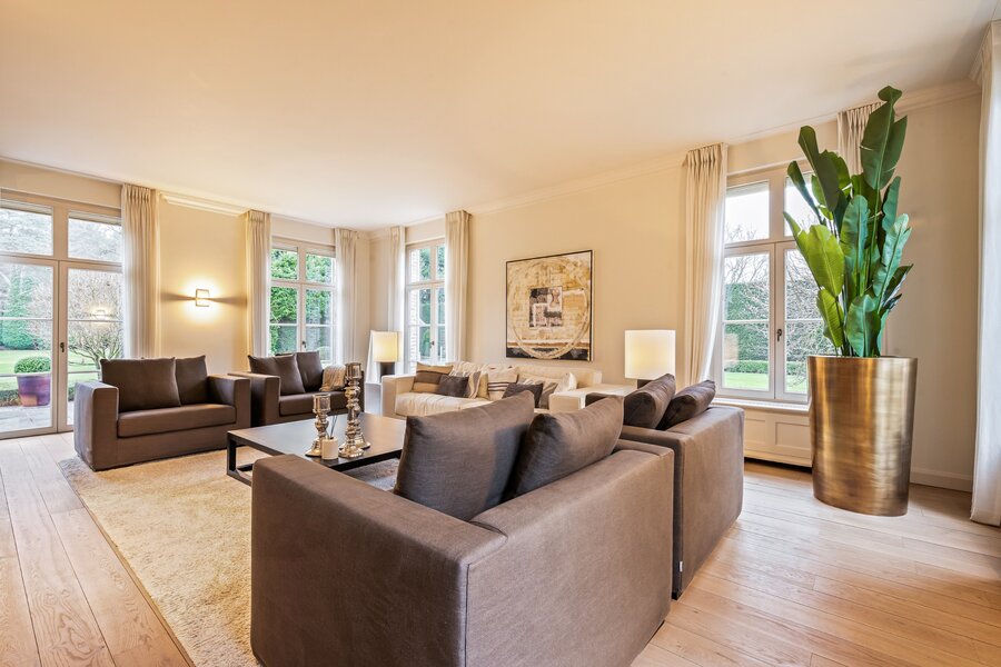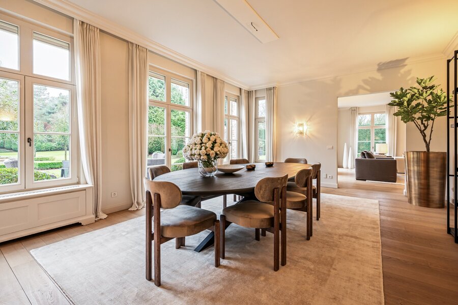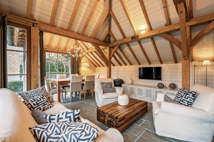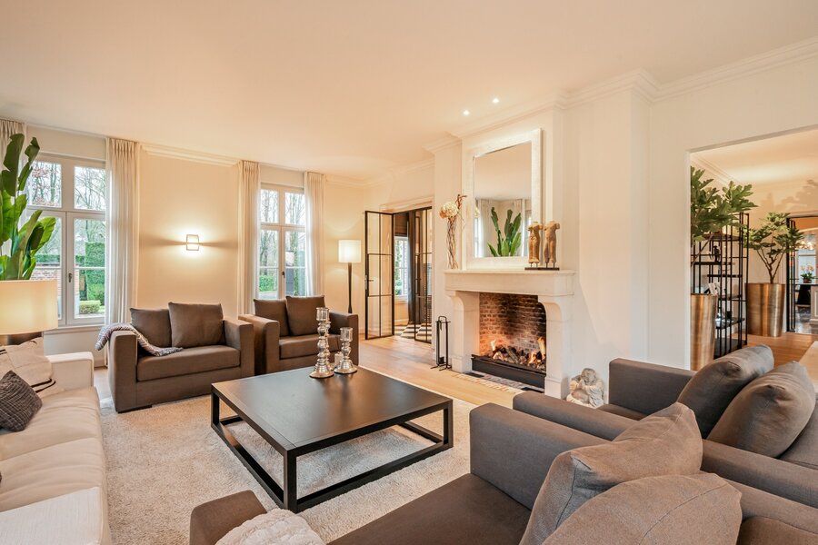 Centrale inkomhal met vestiaire, gastentoilet en de houten trap naar de verdieping toe. Aan de linkerzijde treft u een mooie TV-kamer en via de dubbel openslaande smeedijzeren deuren in de hal komen we rechtstreeks in de prachtige leefruimte opgedeeld in een gezellige zitruimte met gashaard en een gezellige eetruimte. De volledige leefruimte heeft een mooie connectie met de prachtige tuin door de grote raampartijen.