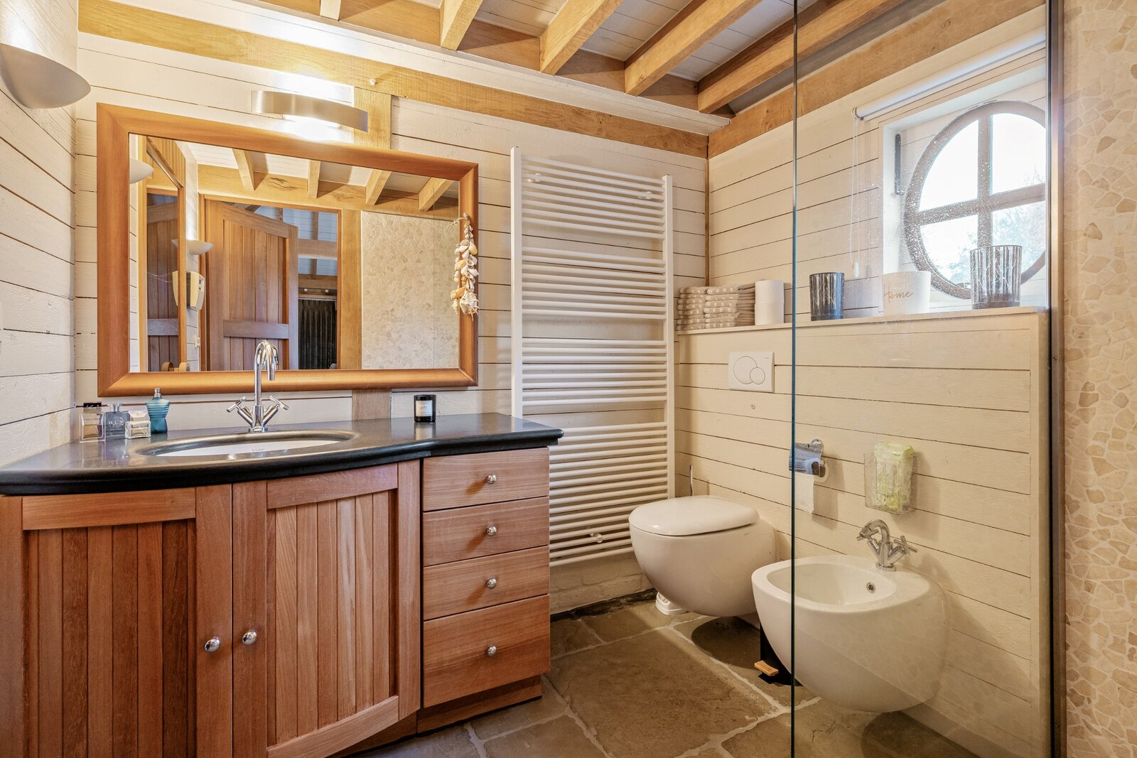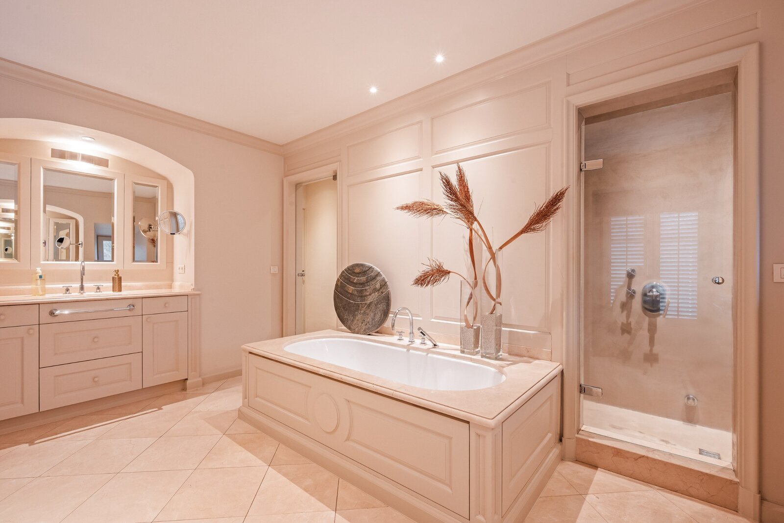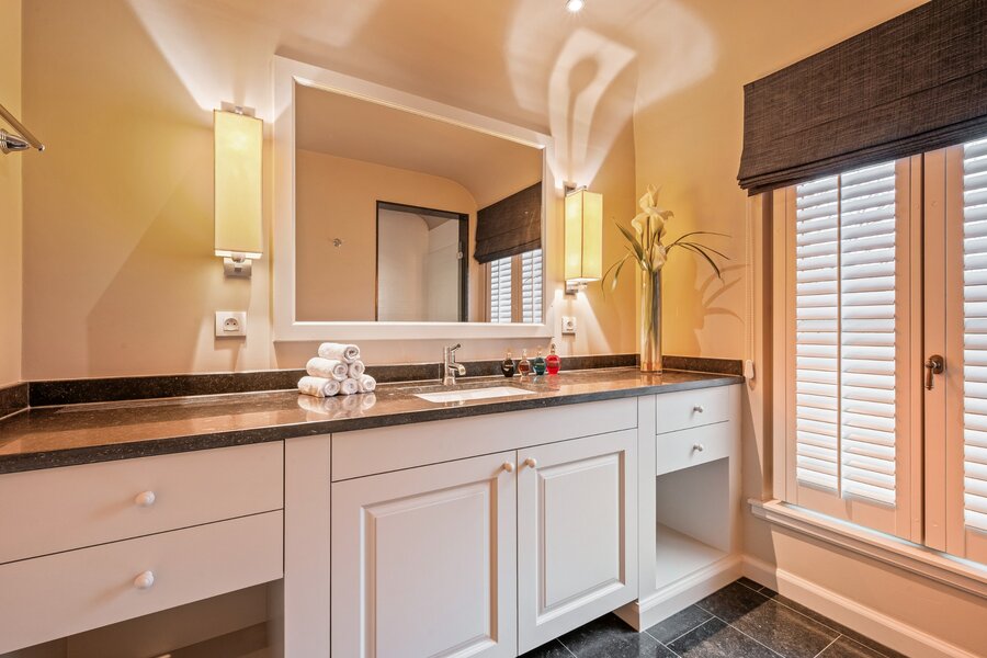 Op de verdieping vinden we de zeer ruime hoofdslaapkamer met dressing en ensuite luxe badkamer voorzien van apart toilet, vrijstaand ligbad, inloopdouche en dubbele wastafel in meubel.