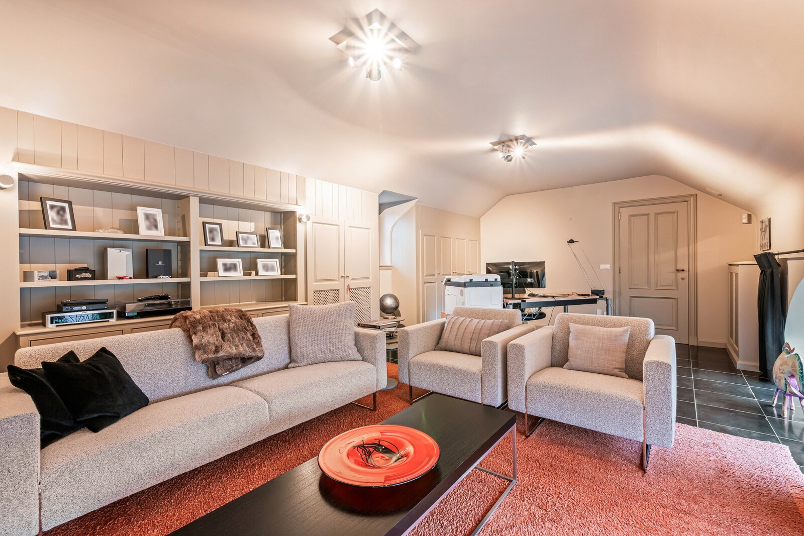 Via een vaste trap op de overloop komt u op de afgewerkte zolderruimte. Hier bevindt zich een prachtige polyvalente ruimte op massief eiken parket, homecinema systeem en veel ingemaakte kasten.