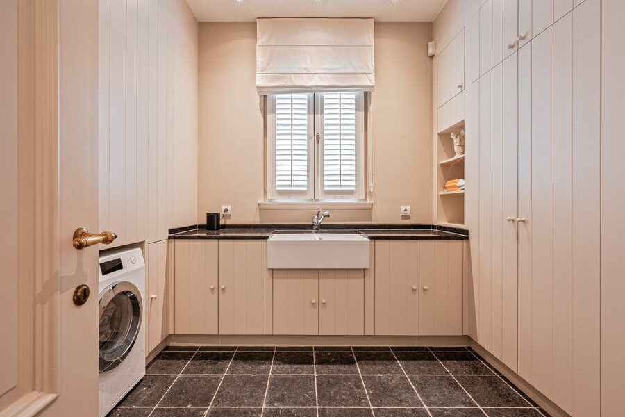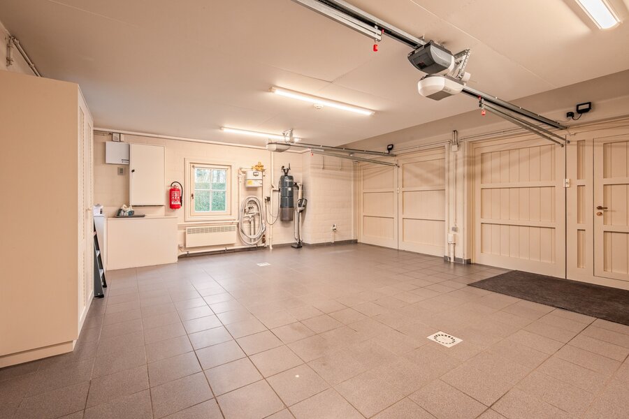 Verder treft u op het gelijkvloers nog een aparte wasplaats, een extra toilet en een dubbel inpandige garage voorzien van sectionaal poorten.
