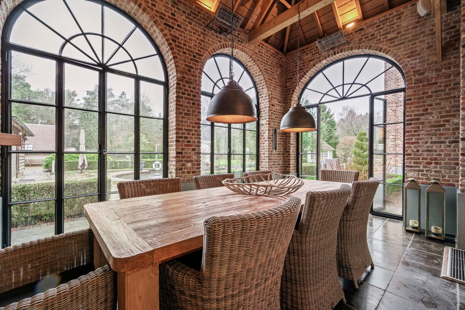 Vanuit de keuken kan u rechtstreeks naar de aangebouwde orangerie. Deze ruimte beschikte over een open haard (op hout) en terrasverwarmers. Een prachtig verlangstuk aan de keuken met een fenomenaal zicht over de tuin.