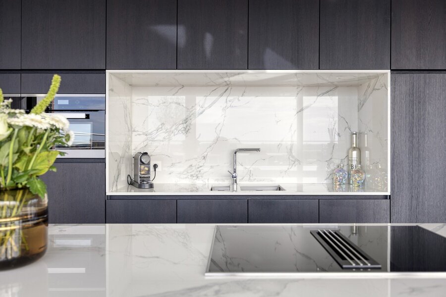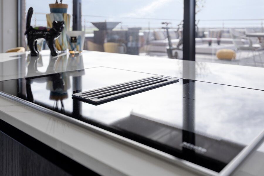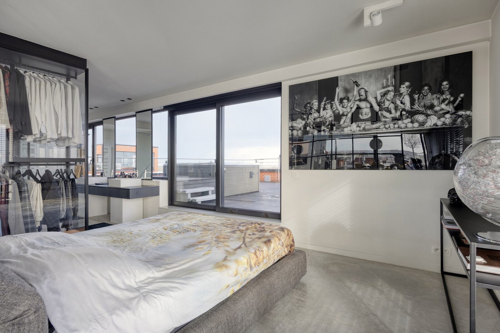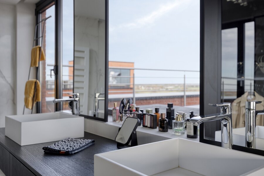 With a living area of approximately 150 m², this penthouse features a thoughtful layout and high-end finishes throughout. The entrance hall leads to a spacious living and dining area, connected to a fully equipped Miele kitchen including a wine cooler and an elegant marble worktop. From this living space, you access a south-facing terrace of 80 m², fitted with a custom-made table, BBQ/fire pit, and quality outdoor furniture. Sun screens provide optimal comfort.