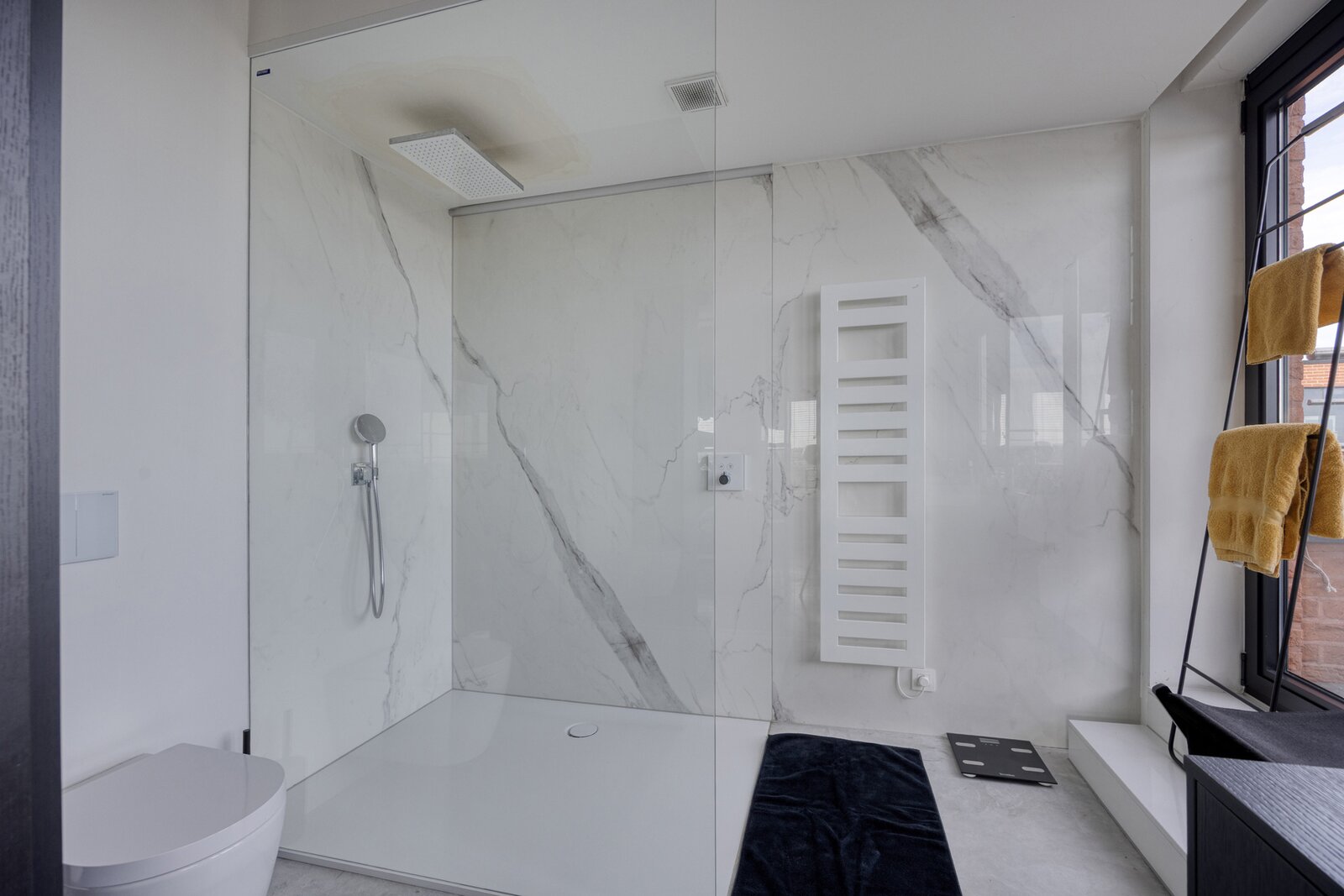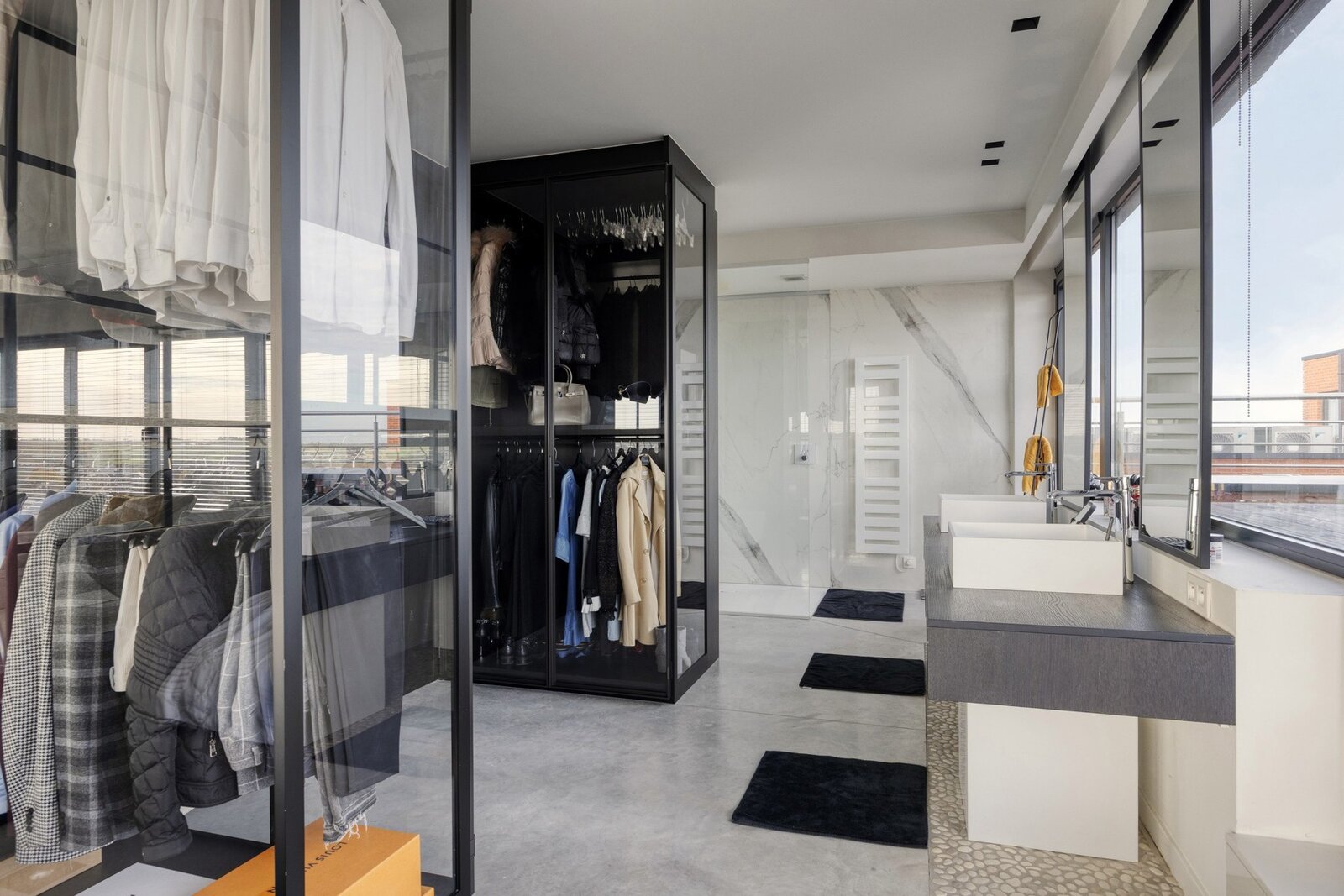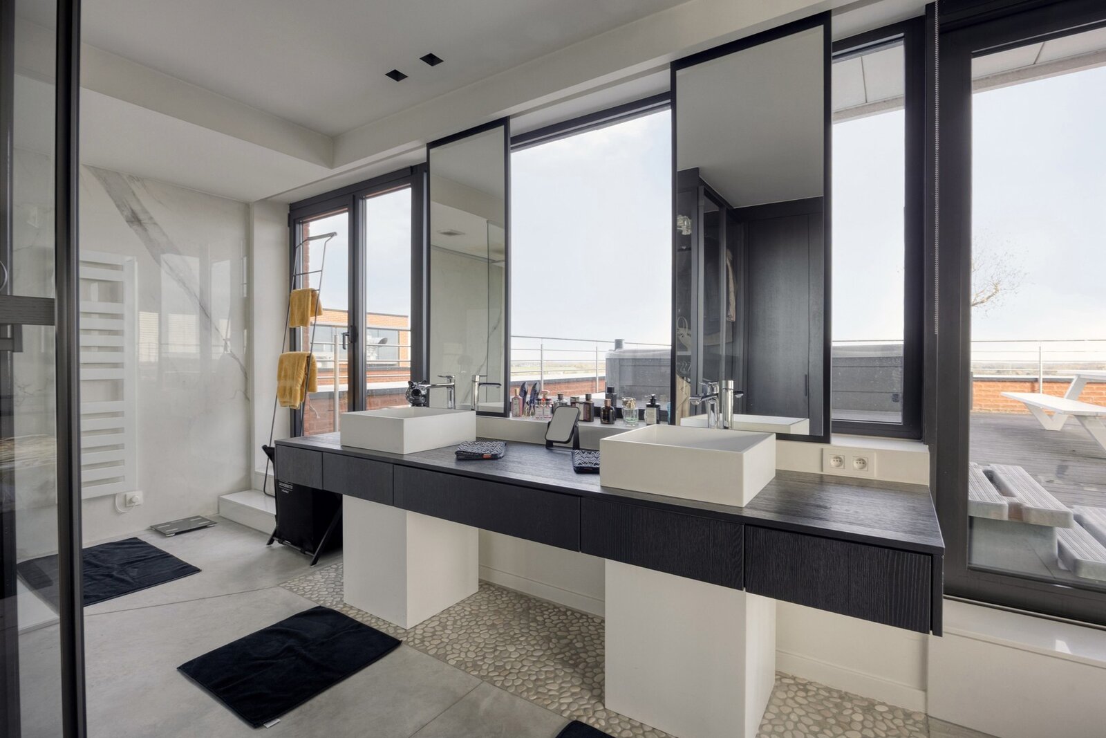 With a living area of approximately 150 m², this penthouse features a thoughtful layout and high-end finishes throughout. The entrance hall leads to a spacious living and dining area, connected to a fully equipped Miele kitchen including a wine cooler and an elegant marble worktop. From this living space, you access a south-facing terrace of 80 m², fitted with a custom-made table, BBQ/fire pit, and quality outdoor furniture. Sun screens provide optimal comfort.