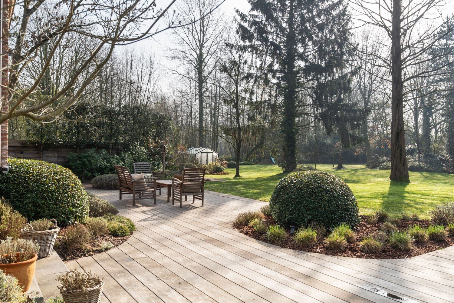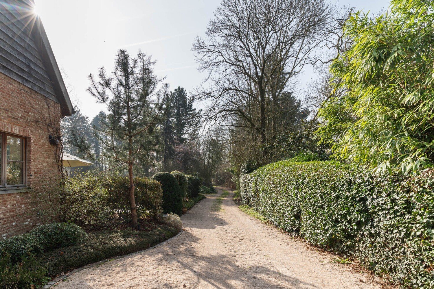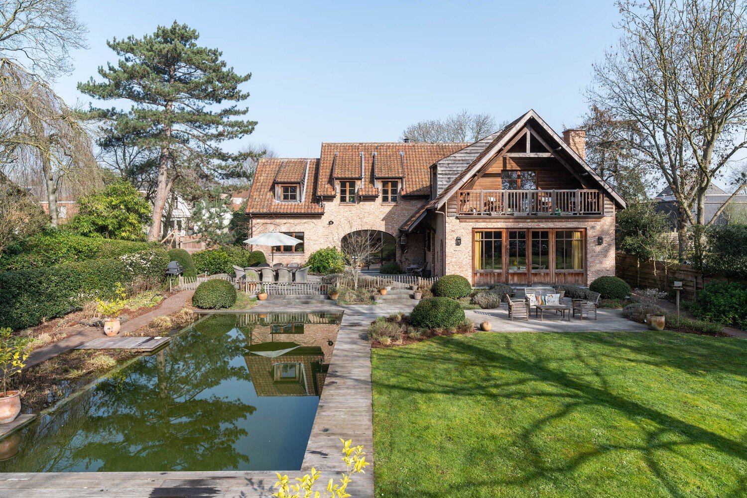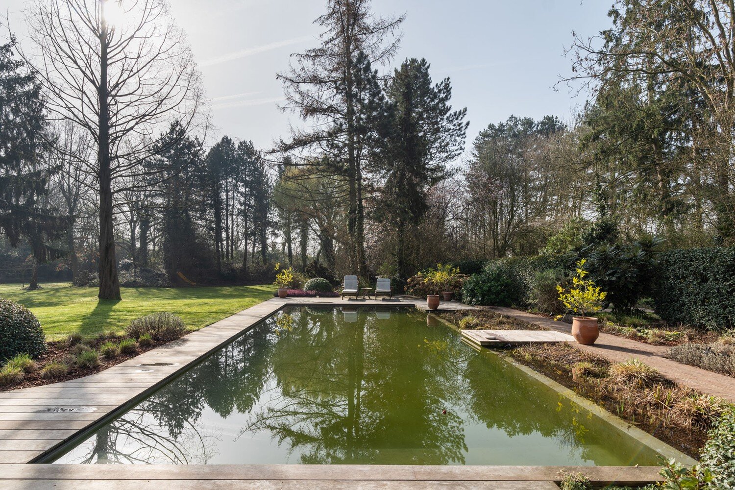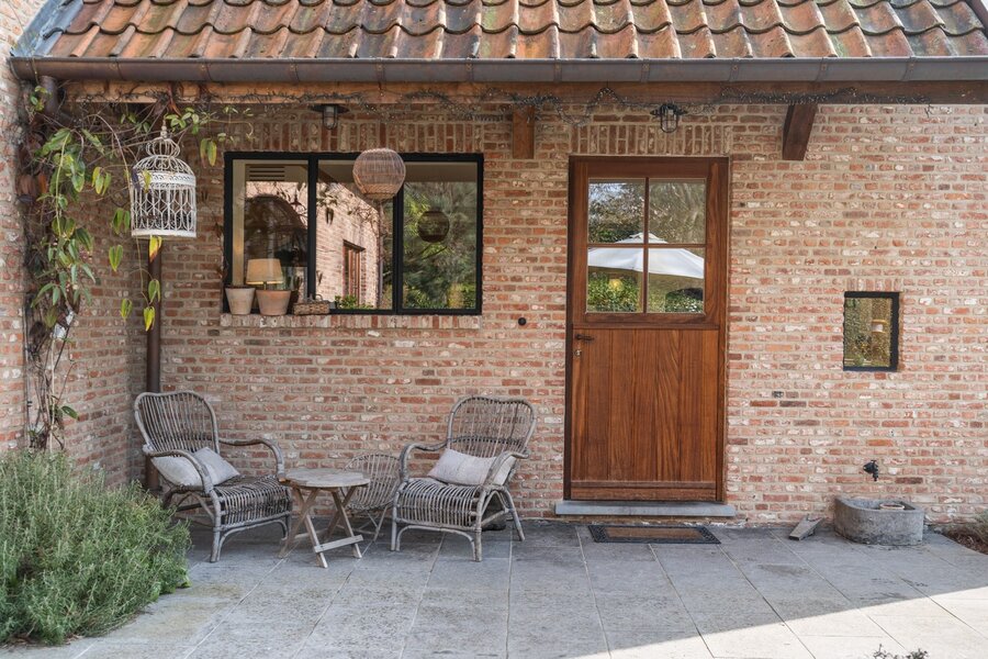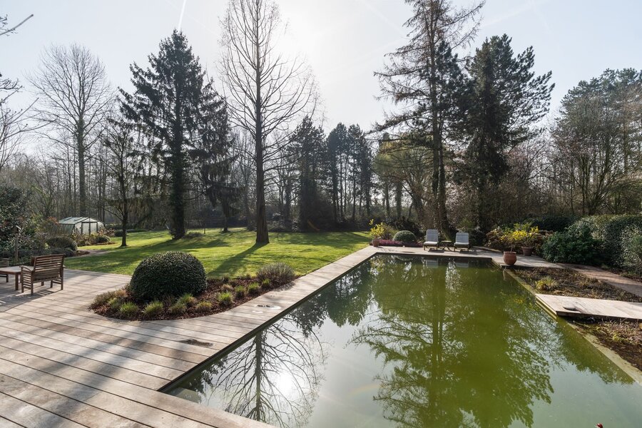 De buitenruimte met volledige privacy is een waar landschapsdecor waar elke zone zijn eigen sfeer heeft. De natuurlijke zwemvijver vormt het groene middelpunt van het perceel en wordt omringd door sierlijk aangelegde borders, doordachte zichtlijnen en uitnodigende tuin. Het geheel creëert een unieke woonbeleving waarin landelijke charme en modern wooncomfort elkaar volmaakt ontmoeten en waar elke dag aanvoelt als een ontspannen verblijf in het groen.