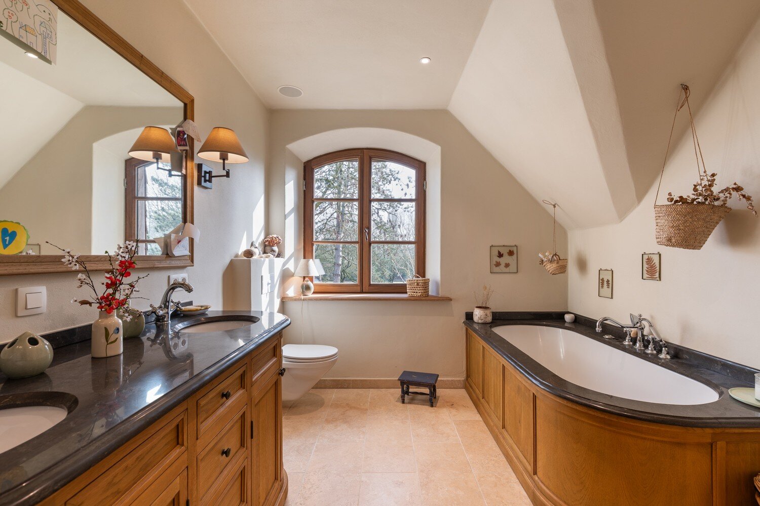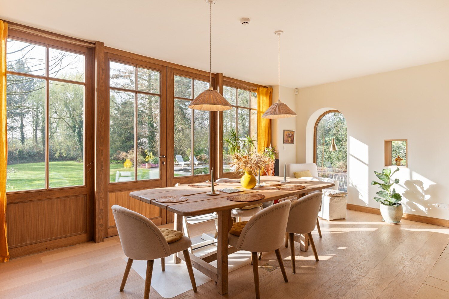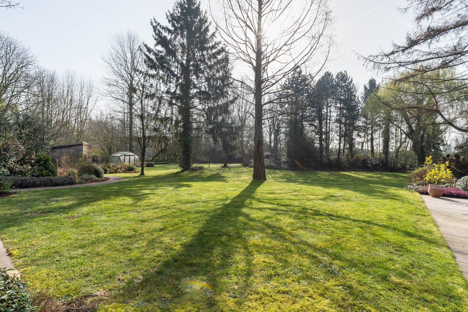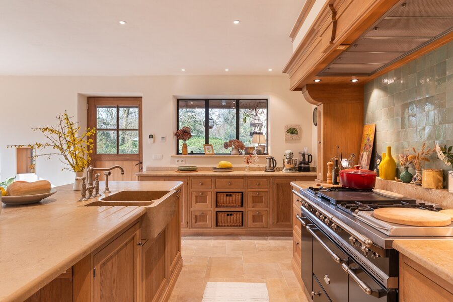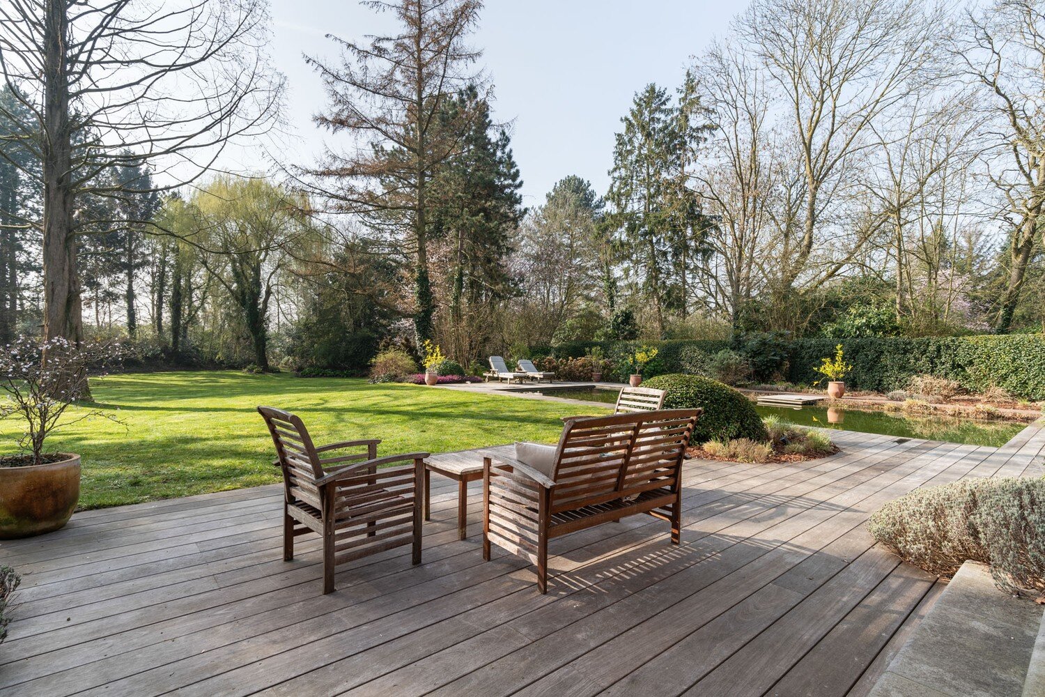De buitenruimte met volledige privacy is een waar landschapsdecor waar elke zone zijn eigen sfeer heeft. De natuurlijke zwemvijver vormt het groene middelpunt van het perceel en wordt omringd door sierlijk aangelegde borders, doordachte zichtlijnen en uitnodigende tuin. Het geheel creëert een unieke woonbeleving waarin landelijke charme en modern wooncomfort elkaar volmaakt ontmoeten en waar elke dag aanvoelt als een ontspannen verblijf in het groen.