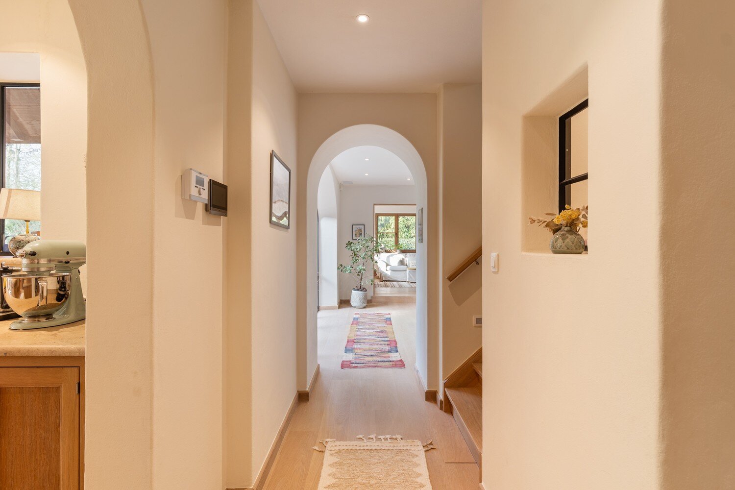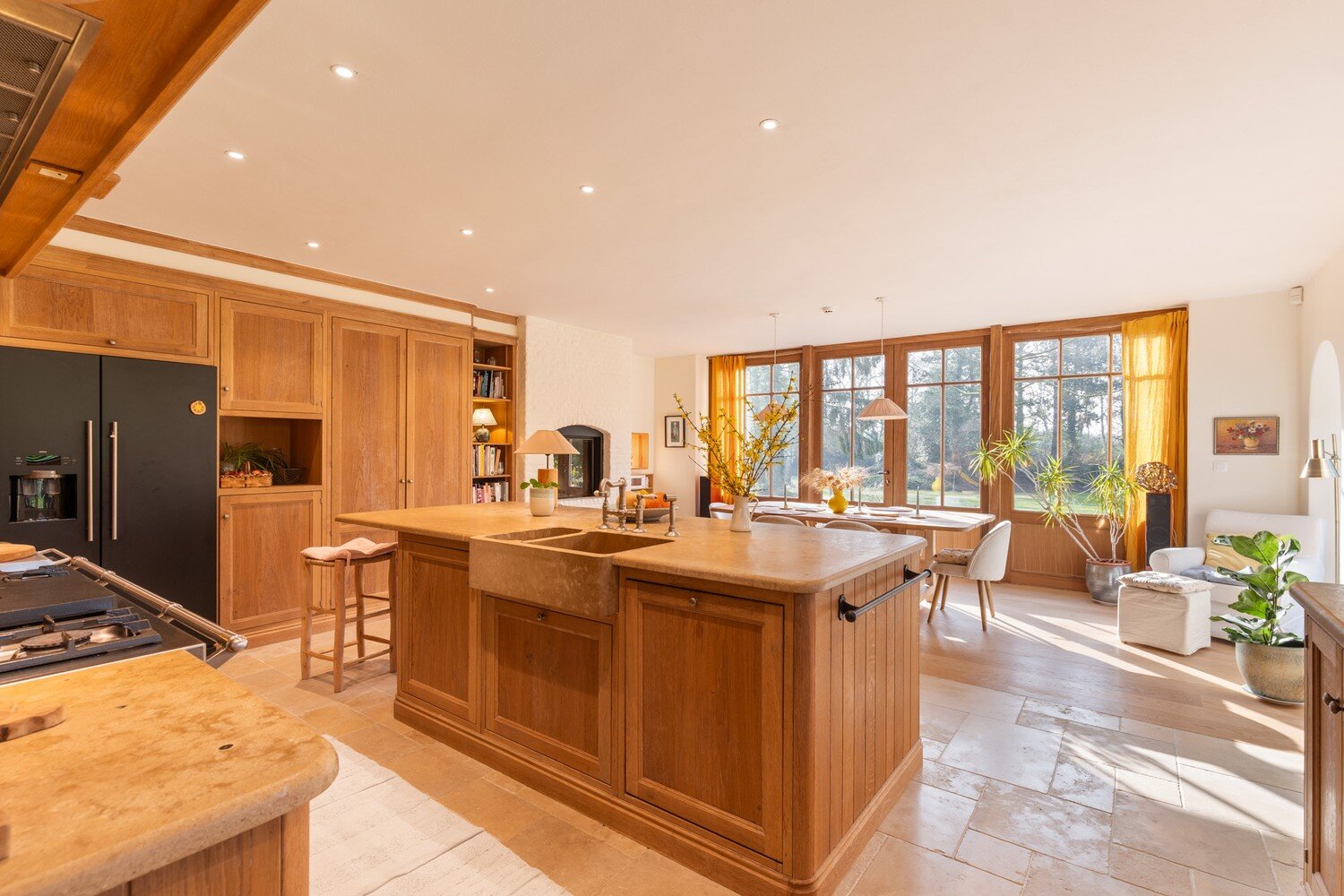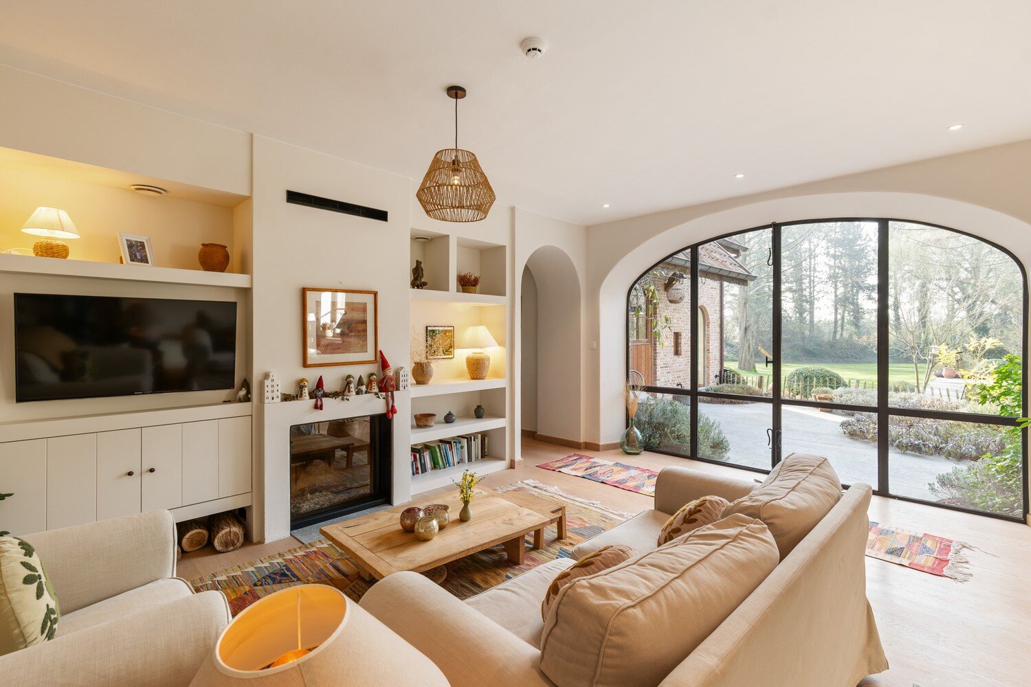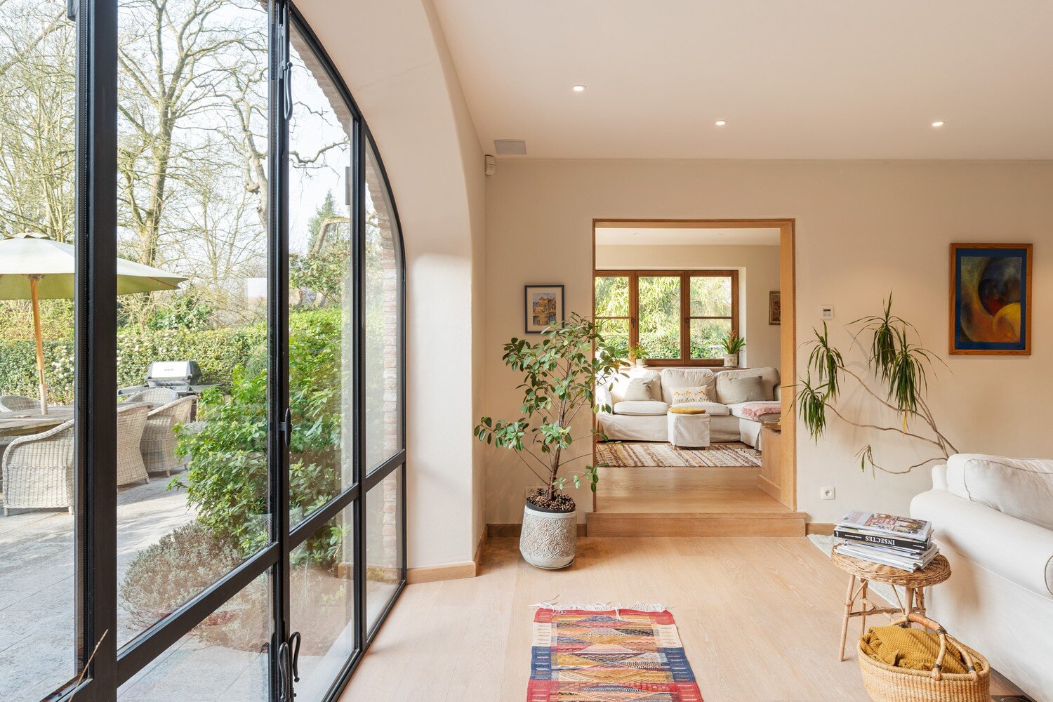 De inkomhal verwelkomt met een gastentoilet en vestiarie en leidt naar een ruime leefruimte die dankzij de open indeling uitnodigt om te genieten van licht, zicht en gezelligheid. Aansluitend ligt een sfeervolle bibliotheekhoek die lezen en loungen een eigen plaats geeft en op het gelijkvloers bevindt zich ook een volwaardige bureau/of speelruimte. De leefkeuken is het kloppend hart van de woning waar koken, tafelen en samenzijn elkaar versterken. De praktische wasruimte/berging en de grote kelder zorgen voor een ongezien comfort aan opbergruimte en organisatie.