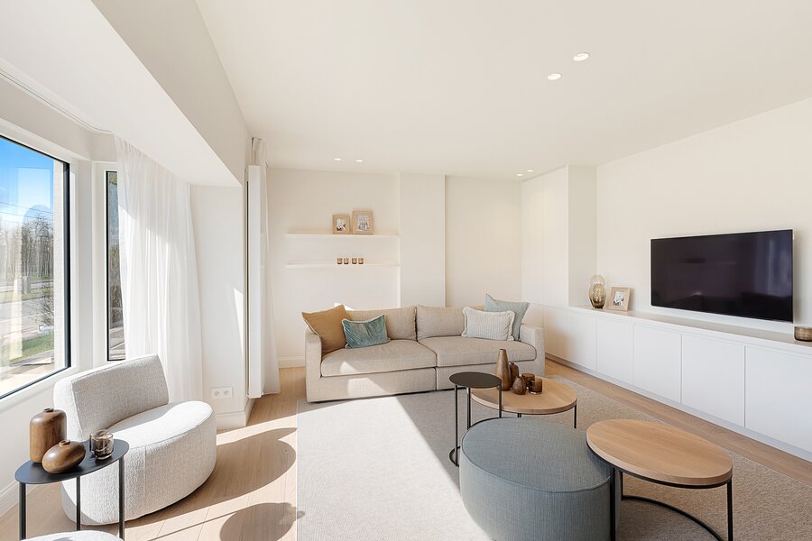 Upon entering the home, you are welcomed into a spacious entry hall that leads to the bright living area. The open living area with a fully equipped open kitchen forms the heart of the home and, thanks to the large windows, enjoys an abundance of natural light. The stylish kitchen features high-quality appliances and a sleek design, perfect for those who love cooking and socializing.