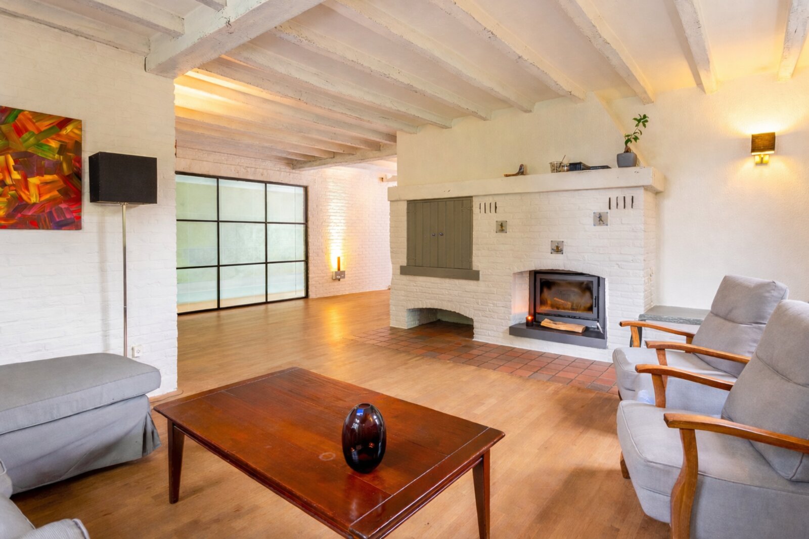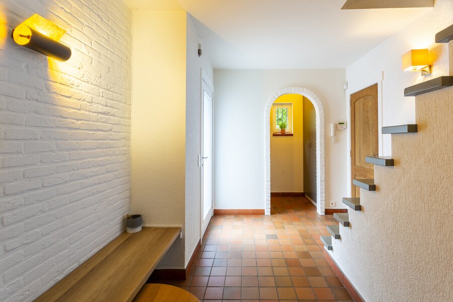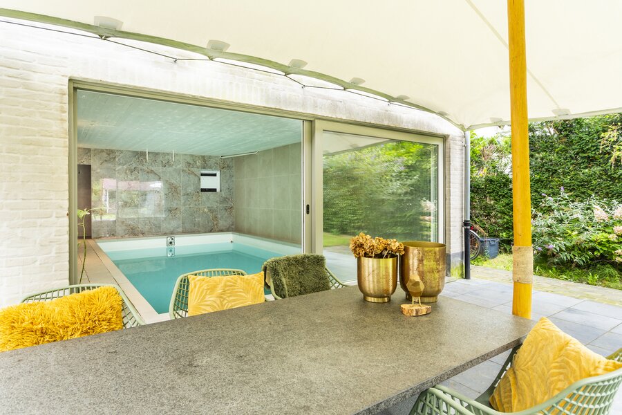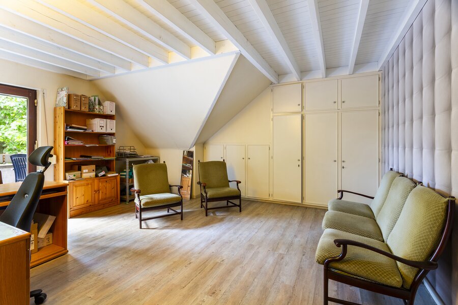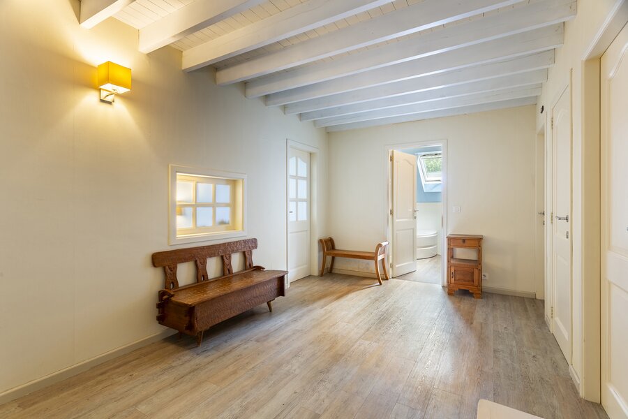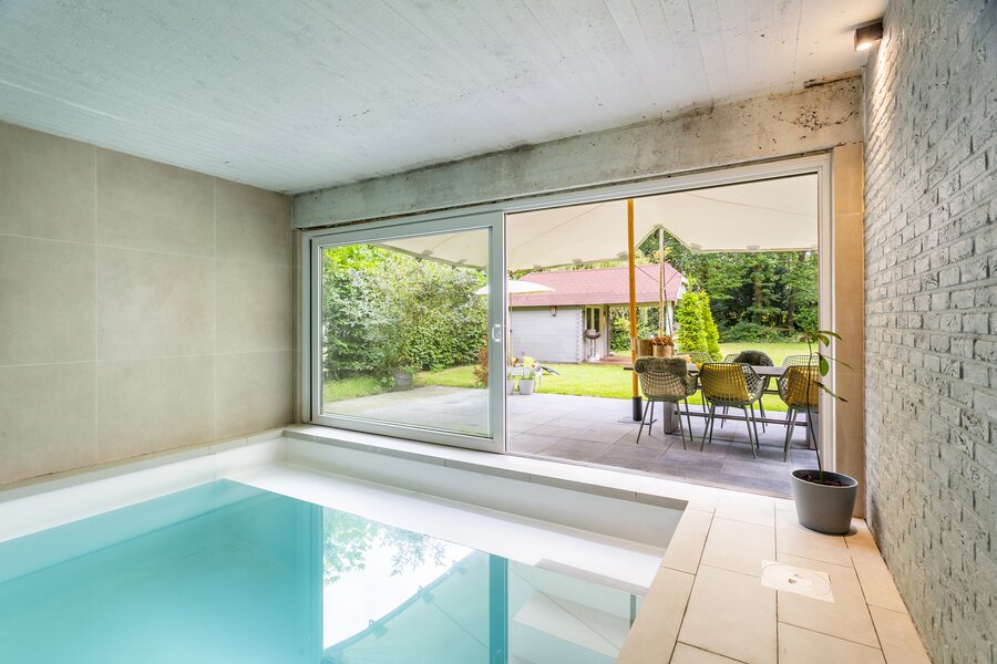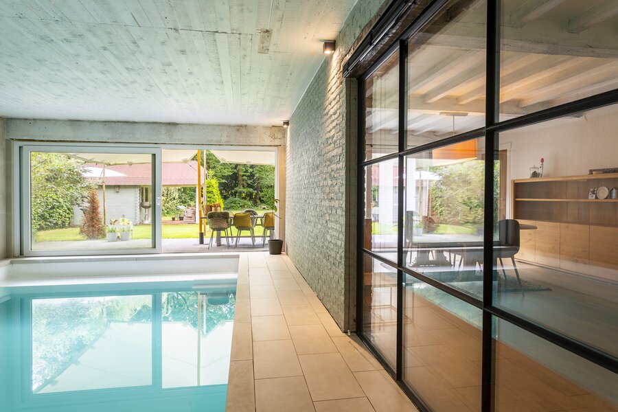 The entrance hall with cloakroom and guest toilet leads to the living room with fireplace. The whitewashed beams on the ceiling and the oak parquet floor contribute to the warm and atmospheric appearance of the interior. A special feature of this house is the indoor swimming pool, which is beautifully visible from the living room and the garden terrace.