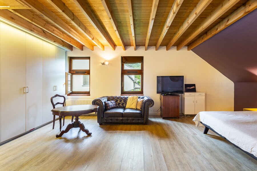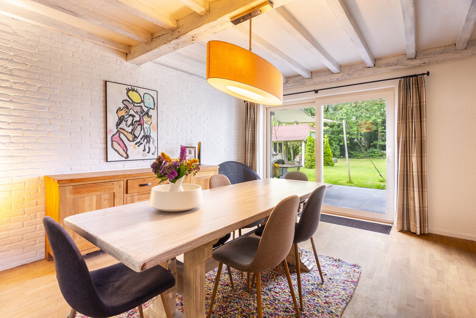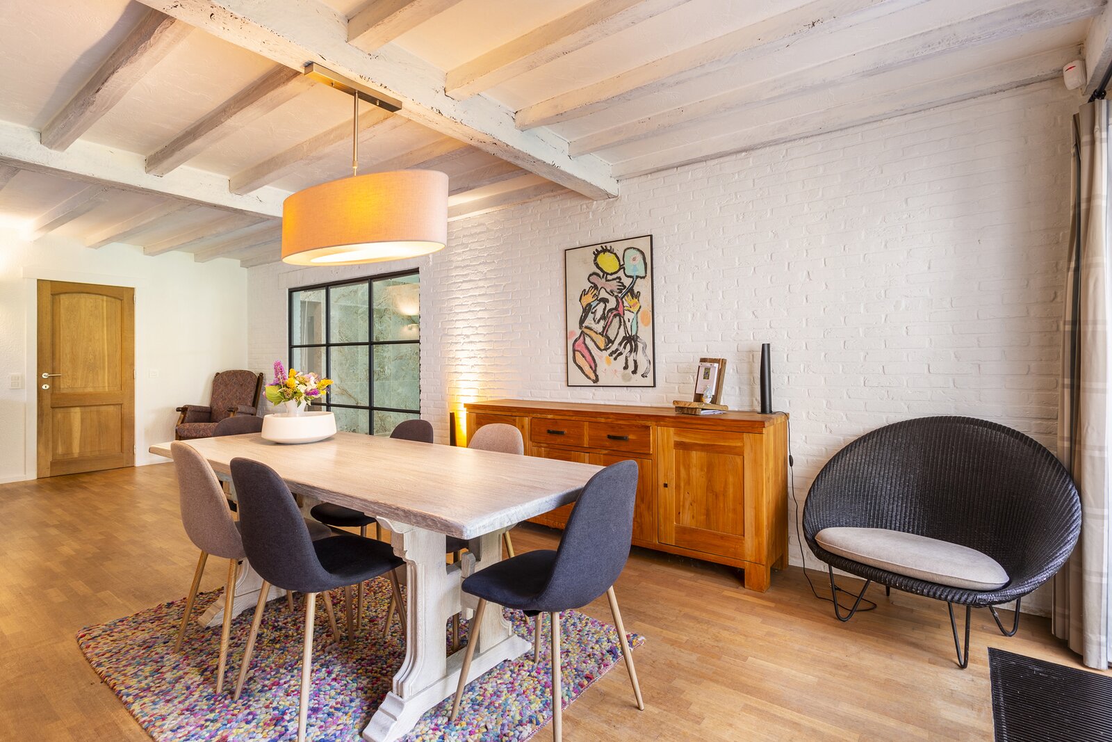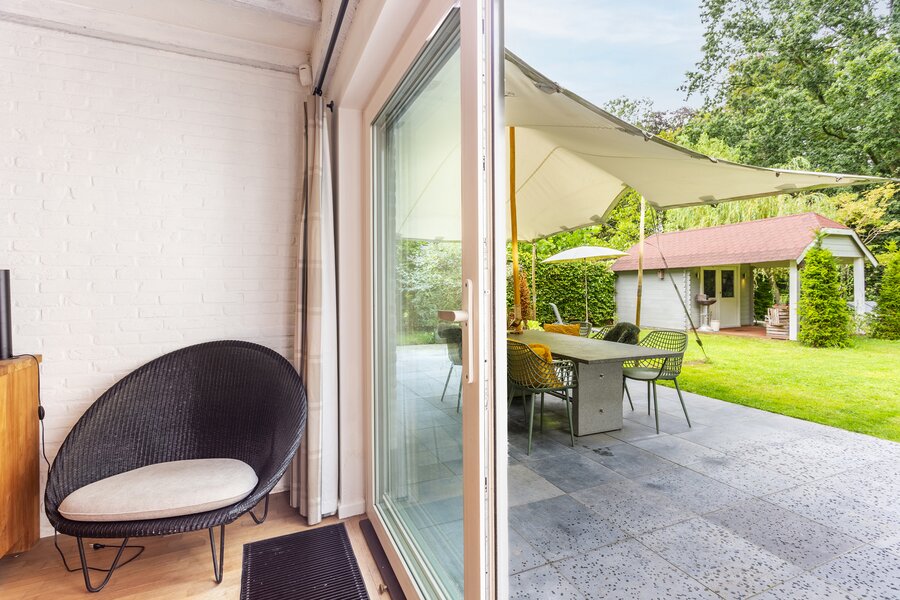 The entrance hall with cloakroom and guest toilet leads to the living room with fireplace. The whitewashed beams on the ceiling and the oak parquet floor contribute to the warm and atmospheric appearance of the interior. A special feature of this house is the indoor swimming pool, which is beautifully visible from the living room and the garden terrace.