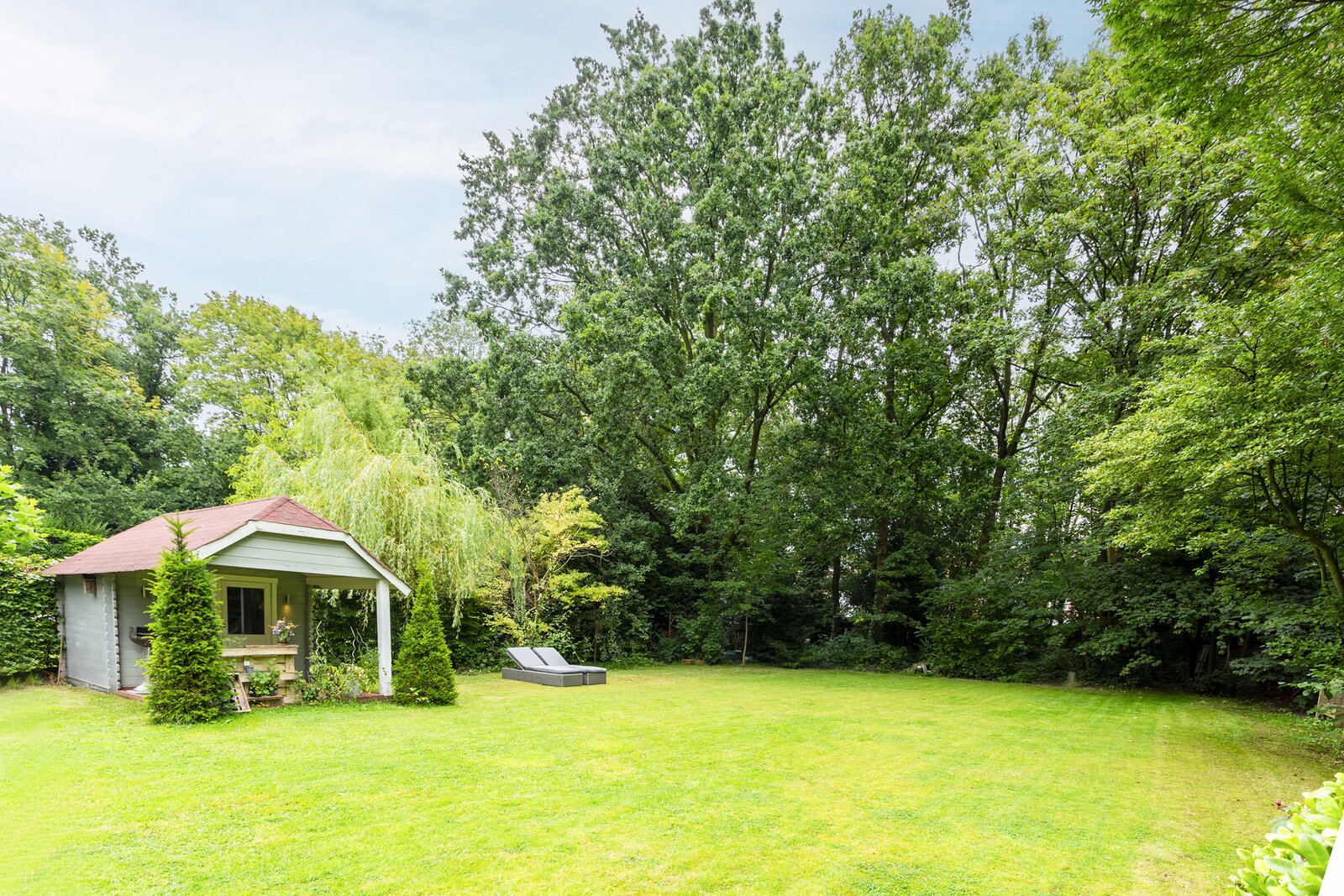 The large garden has a lovely play forest at the back.