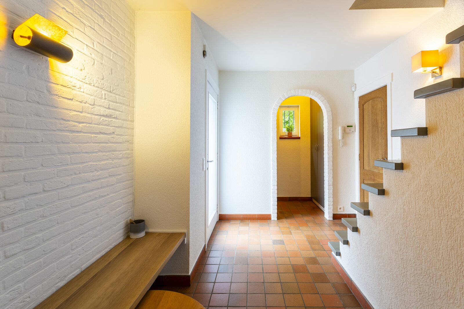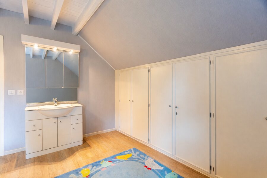 The entrance hall and staircase lead to the first floor, where you will find five spacious bedrooms, one of which has a terrace. Two of these bedrooms have a washbasin, offering extra comfort.