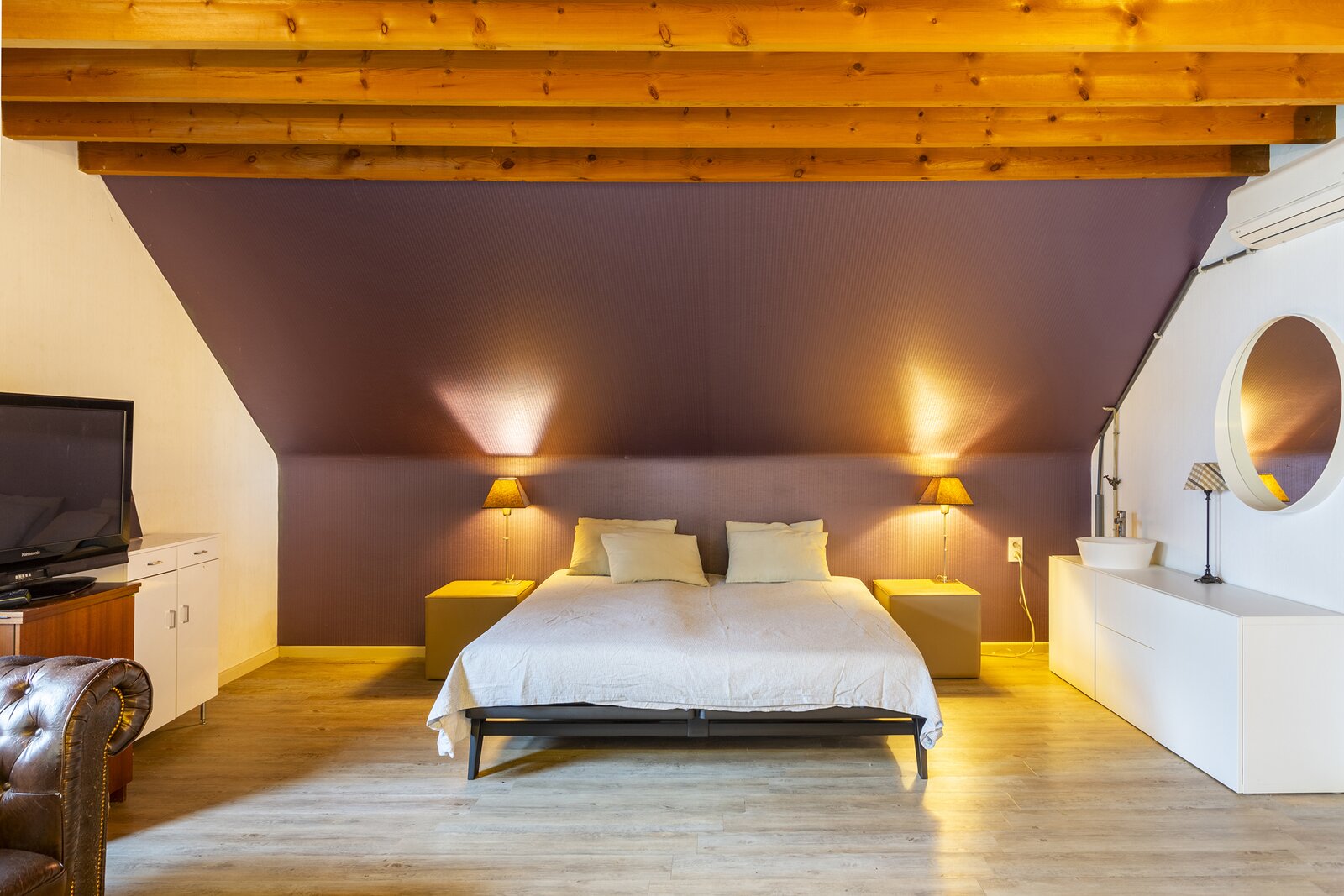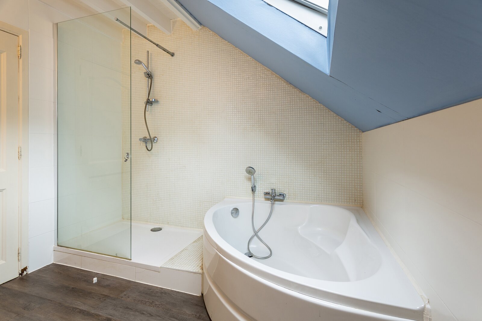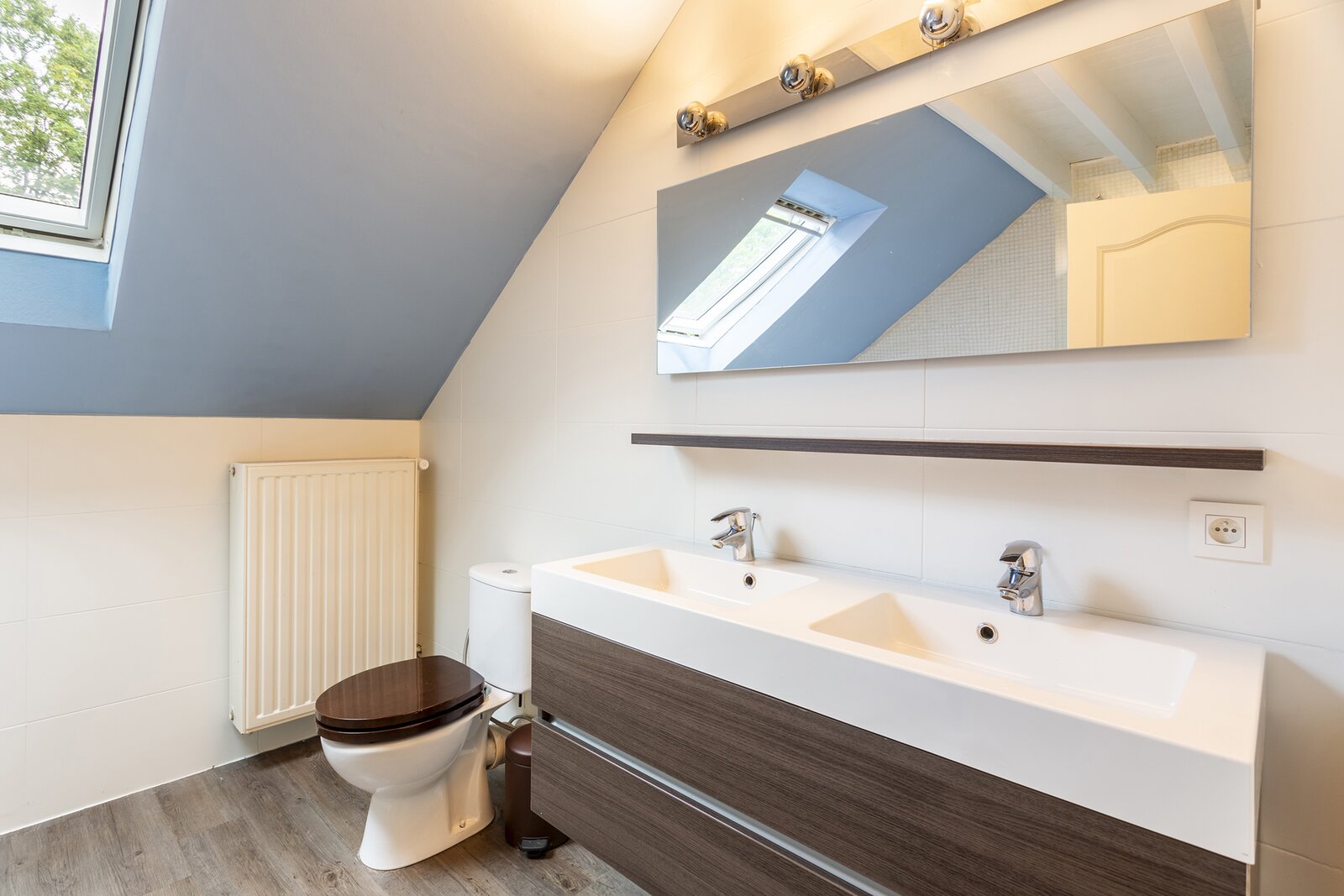 The bathroom is equipped with a double washbasin, bathtub and separate shower, perfect for relaxation after a long day.
