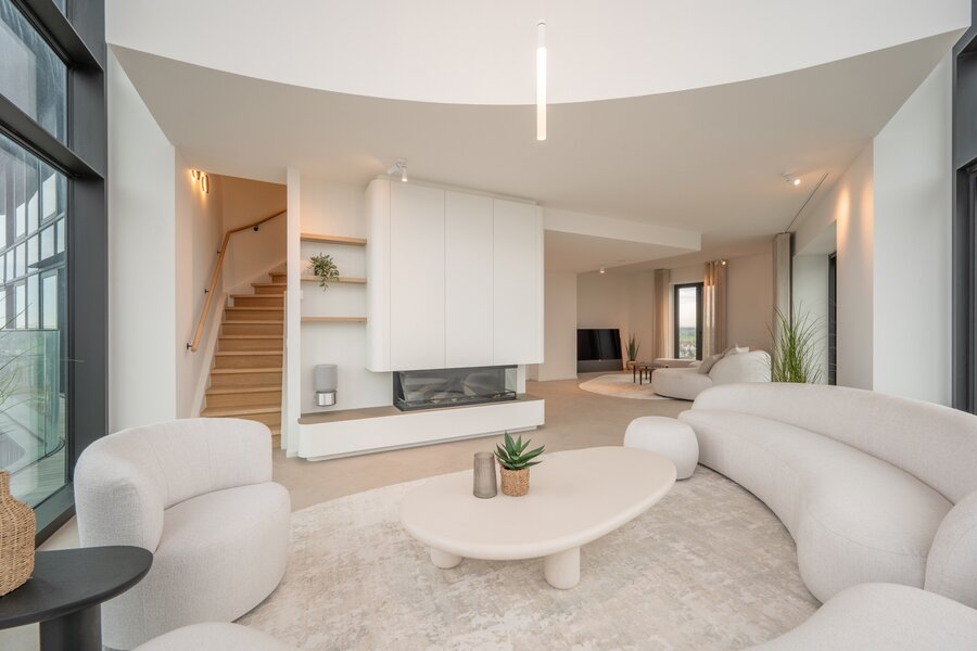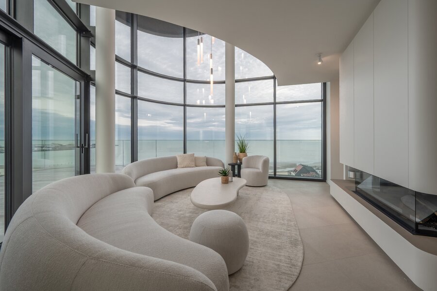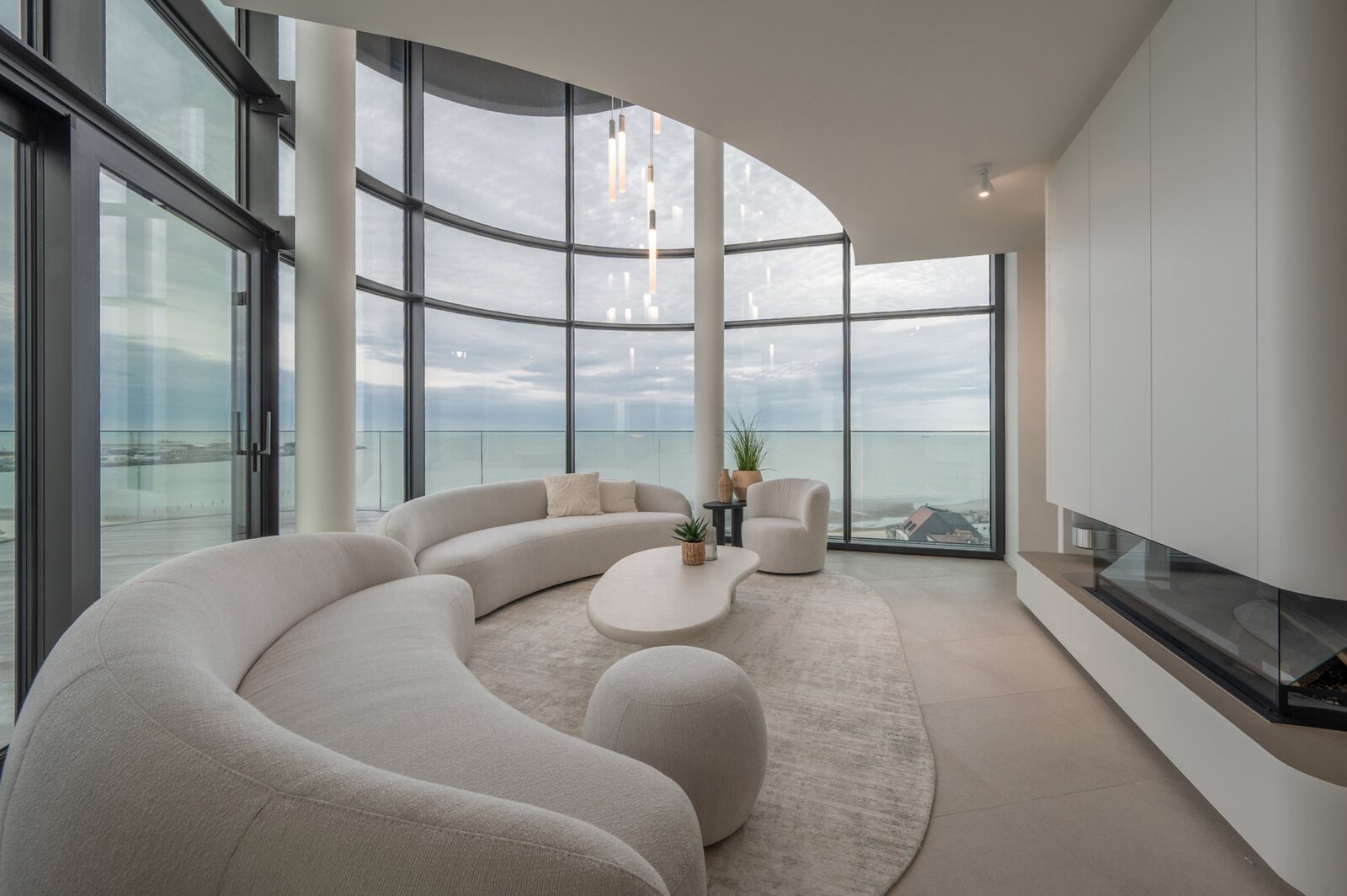 The entrance hall leads into the impressive living area, where floor-to-ceiling windows offer breathtaking views over Knokke and the sea. The elegant gas fireplace forms a warm focal point, while the striking double-height void above the living room enhances the sense of space, light, and architectural grandeur.