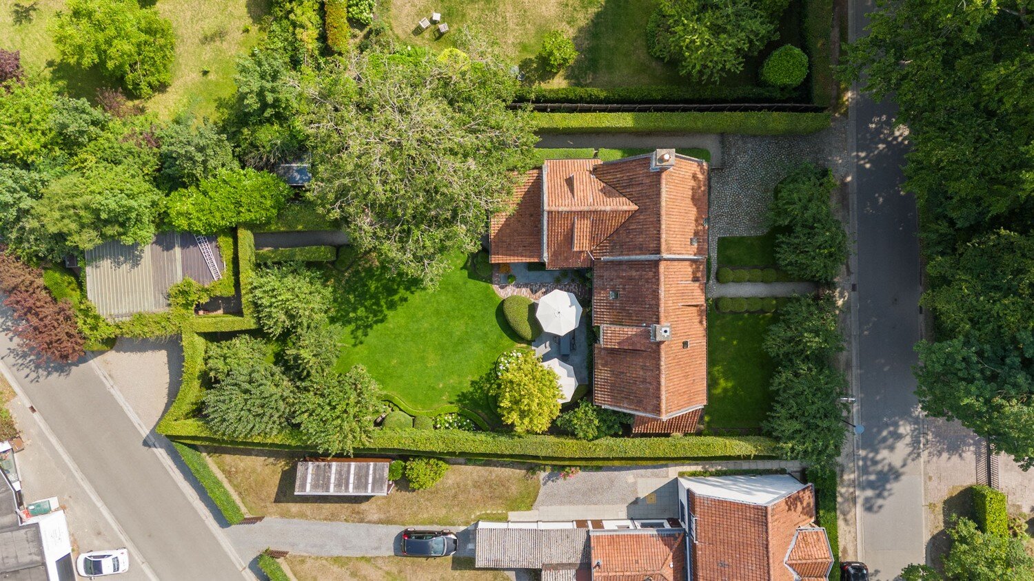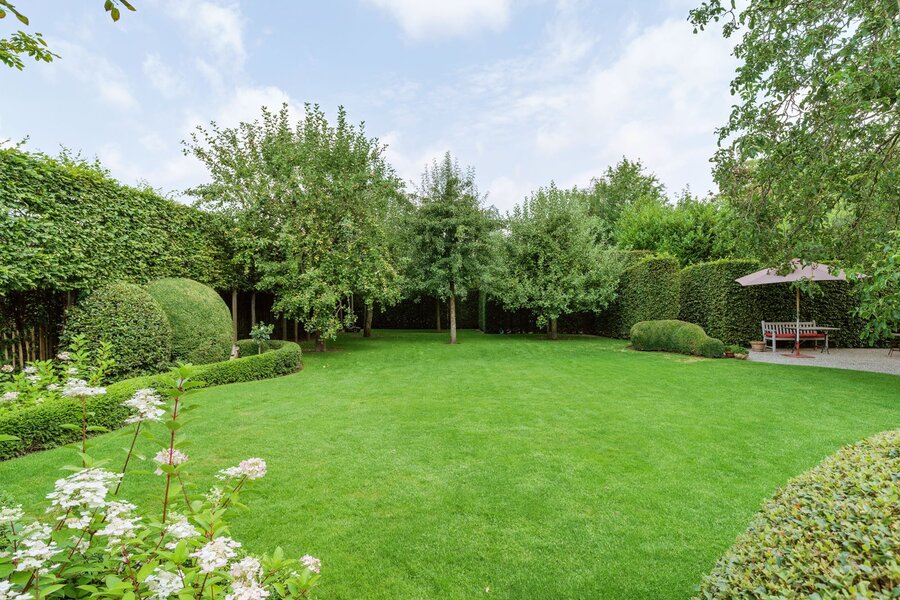 Ervaar hoe de hectiek van het leven hier lijkt te stoppen zodra men de voordeur binnenstapt. Hier kan u écht ontspannen, in de woning maar ook in de prachtig aangelegde en piekfijn onderhouden tuin rondom, met verschillende zon- en schaduwplekjes. De tuin is uitgerust met verlichting, waardoor men zowel overdag als ’s avonds kan genieten van het uitzicht op het groen. Het perceel is ook via de achterzijde bereikbaar. Hier zijn een oprit, carport voor twee wagens en een tuinhuis voorzien; dit naast de oprit aan de voorzijde van de woning.