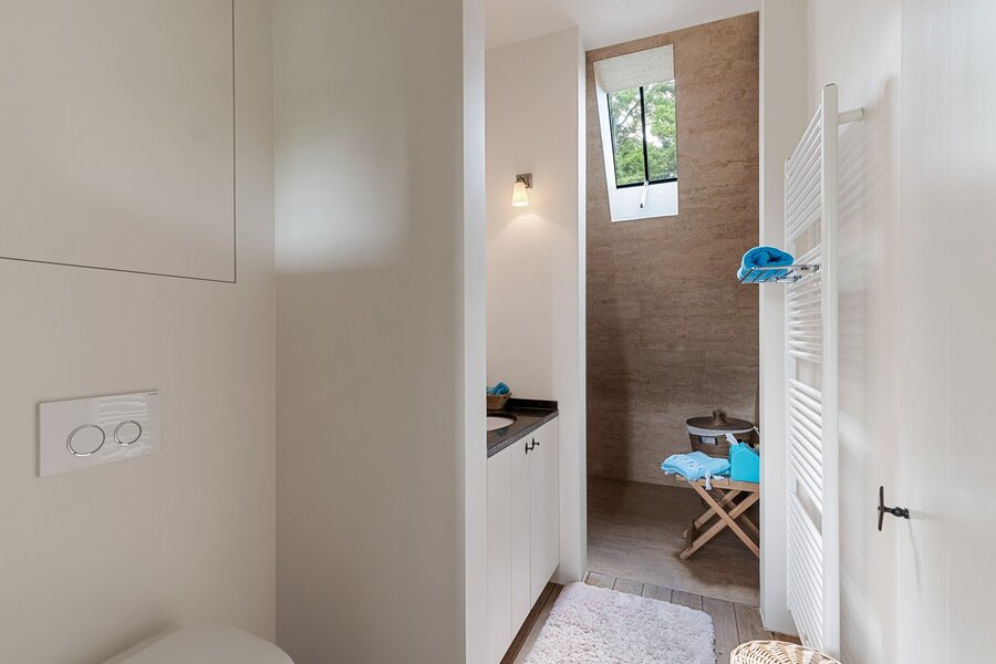 De indeling: op de gelijkvloerse verdieping zijn er een inkomhal, gastentoilet, ruime leefruimte met bureauhoek, keuken met eetplaats, pantry en bijkeuken aanwezig. Er is een droge, luchtige kelder. Op de eerste verdieping werden twee slaapkamers voorzien samen alsook een douchekamer. Daarnaast is er een volledig master-gedeelte: inloopdressing, ruime slaapkamer en een riante badkamer met bad, inloopdouche, dubbele wastafel en toilet. De zolder is bereikbaar via een trapluik en herbergt de technieken.