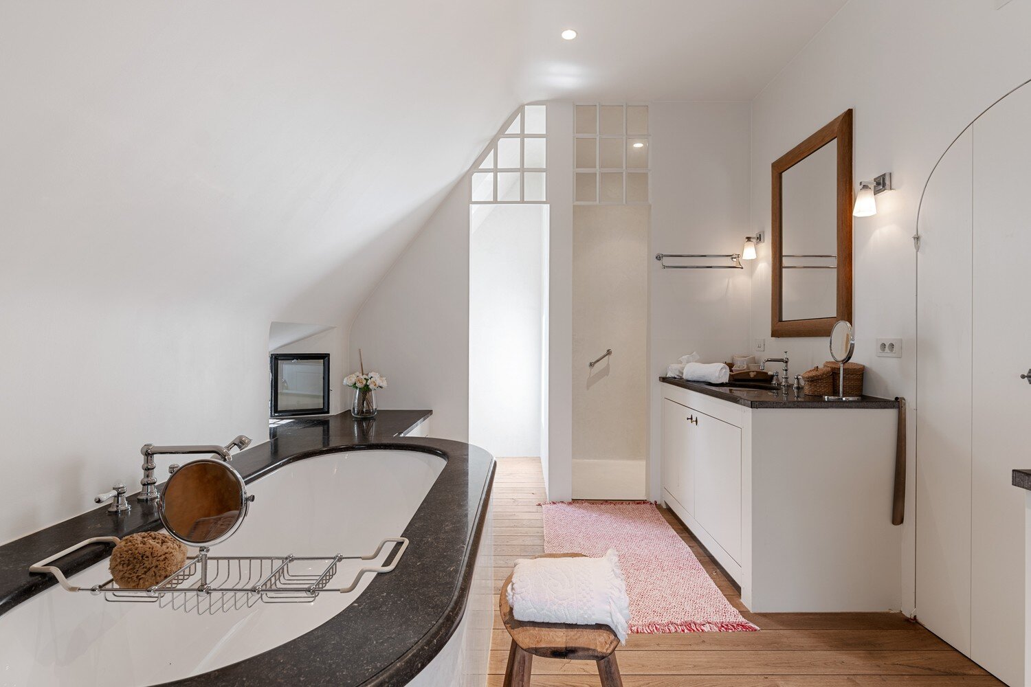 De stijl van de architect komt overal terug: in het speciale metselwerk in wildverband, het handmatig aangebrachte pleisterwerk, de afgeronde muren, schuine zijkanten van de raamopeningen, faux marbre schildertechniek, smeedijzeren elementen … Dit alles zorgt ervoor dat u een bepaalde eenheid en samenhang ervaart die vandaag zeer zeldzaam is geworden.