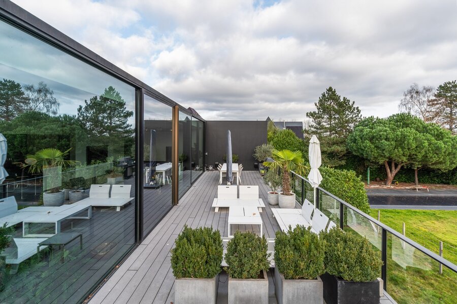 Exclusieve architectenwoning ontworpen door Govaert & Vanhoutte, gelegen in het groene en gegeerde Lemberge (Merelbeke). Een zeldzaam aanbod waar architectuur, luxe en functionaliteit perfect samenkomen. Deze eigendom biedt ca. 460m² bewoonbare oppervlakte en beschikt over twee aparte ingangen, ideaal voor een combinatie van wonen en werken, praktijk aan huis of kangoeroewoning. De woning is afgewerkt met hoogwaardige materialen, moderne technieken en duurzame voorzieningen, wat garant staat voor maximaal comfort. De ruime leefruimte met open ingerichte keuken geniet van indrukwekkende raampartijen en geeft uit op het zuidgericht terras van ca. 80m² en de tuin. In totaal zijn er meerdere slaapkamers, badkamers, multifunctionele ruimtes, een ruime garage voor 2 wagens en extra parkeergelegenheid vooraan. De woning is zeer energiezuinig en heeft een label A, dankzij de 40 zonnepanelen en een thuisbatterij. Eén van de troeven is ook de rustige ligging met uitstekende bereikbaarheid naar Gent en de belangrijkste invalswegen. Uitermate geschikt voor wie wonen in stijl wil combineren met professioneel gebruik.
