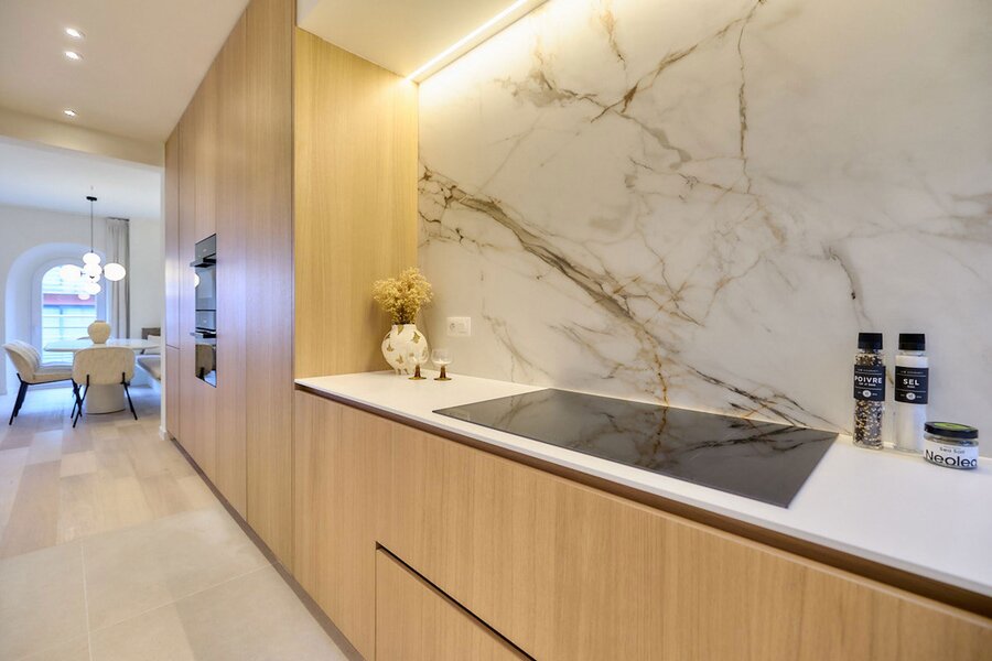 The living kitchen combines refined craftsmanship with modern Miele appliances, while a marble backsplash elegantly highlights the transition to the spacious living and dining area.