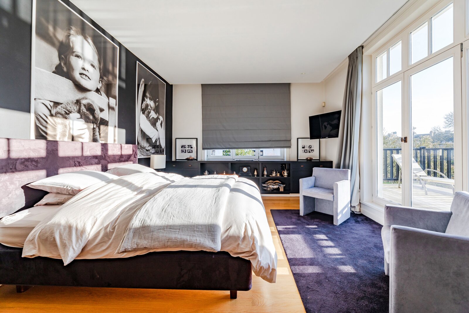 The attic has been converted into a large bedroom with a kitchenette and a bathroom.