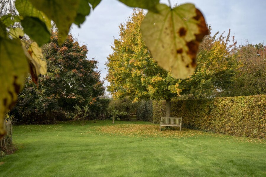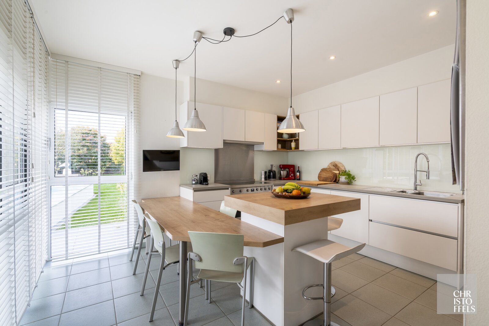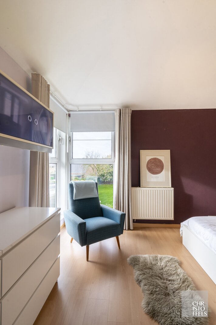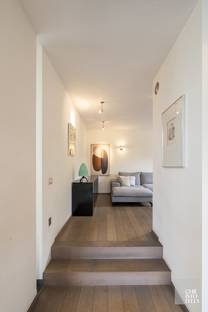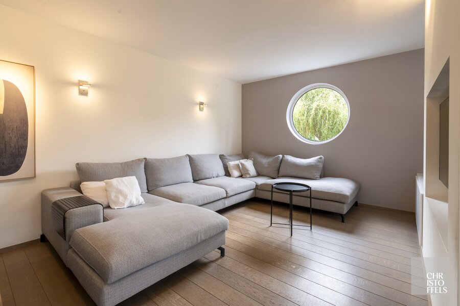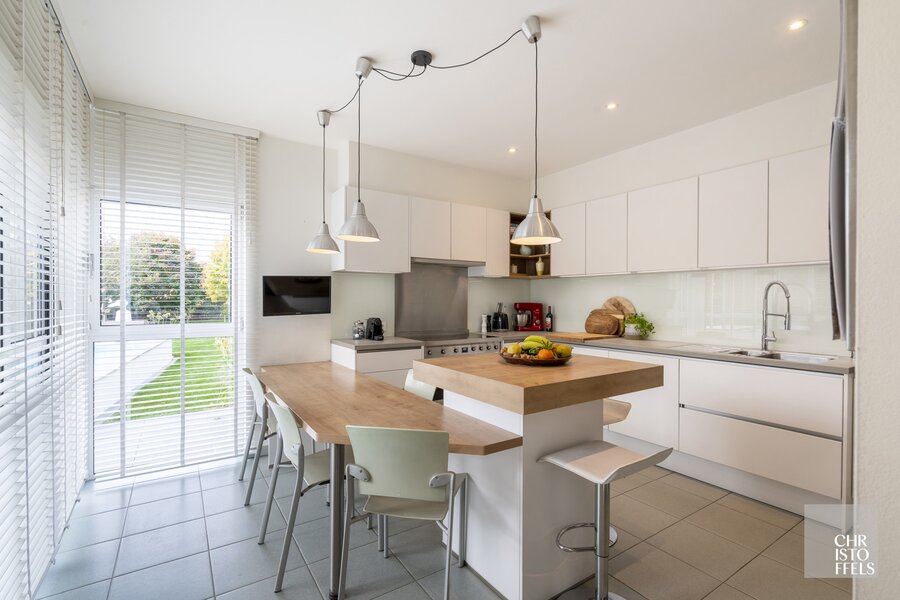 On the ground floor, a spacious entrance hall with a cloakroom and guest toilet welcomes you into the home. From here, you enter the impressive dining area with a double-height ceiling and large windows offering stunning views of the garden. Adjacent is a cozy sitting area with a gas fireplace, alongside a separate TV corner. The dining area also provides access to the renovated luxury kitchen from 2016.